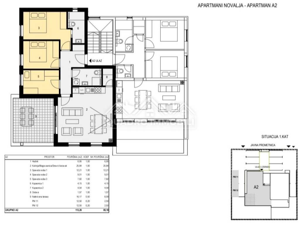 Apartman na prvom katu sastoji se od tri spavaće sobe, dvije kupaonice, ostave, dnevnog boravka s kuhinjom i blagovaonicom te natkrivene terase s prekrasnim pogledom. Stanu pripadaju dva parkirna mjesta.