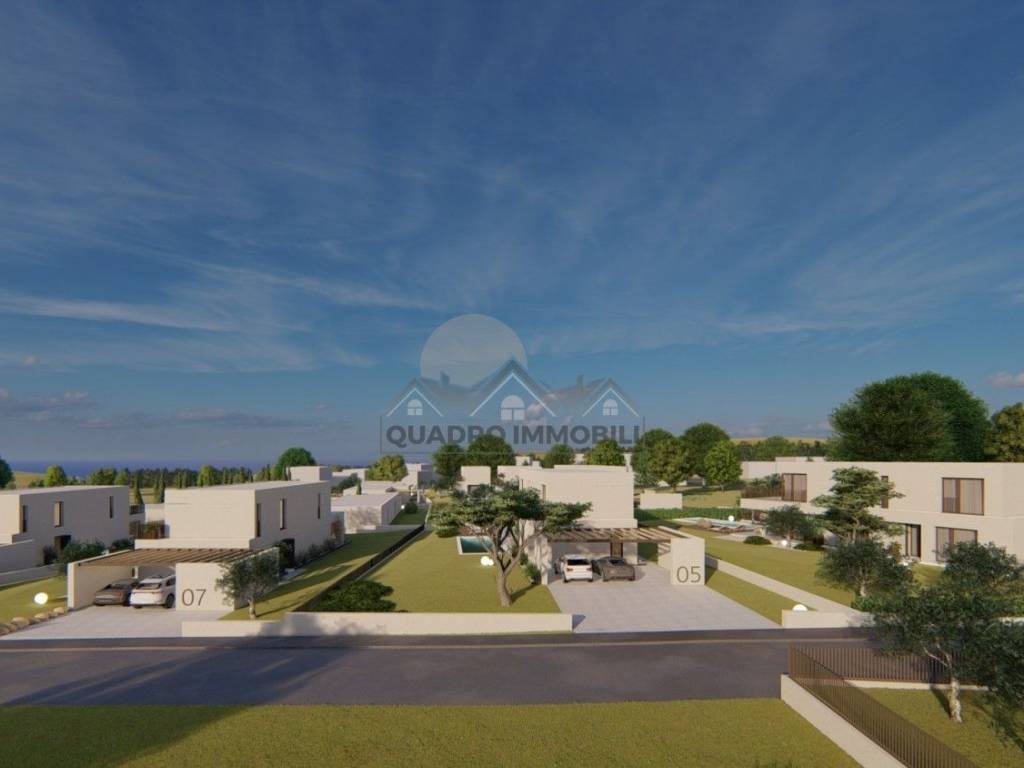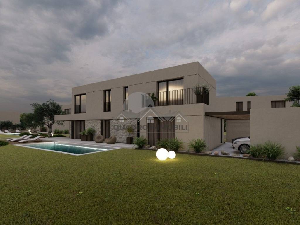 We offer a beautiful modern villa near Poreč under construction. The villa measuring 221.39 m2 will have a kitchen with a dining room and a living room on the ground floor, 1 toilet, 1 bathroom, 1 bedroom, a storage room and a covered terrace, on the first floor there are three bedrooms, each with its own bathroom. Also, one room will have an exit to the terrace.