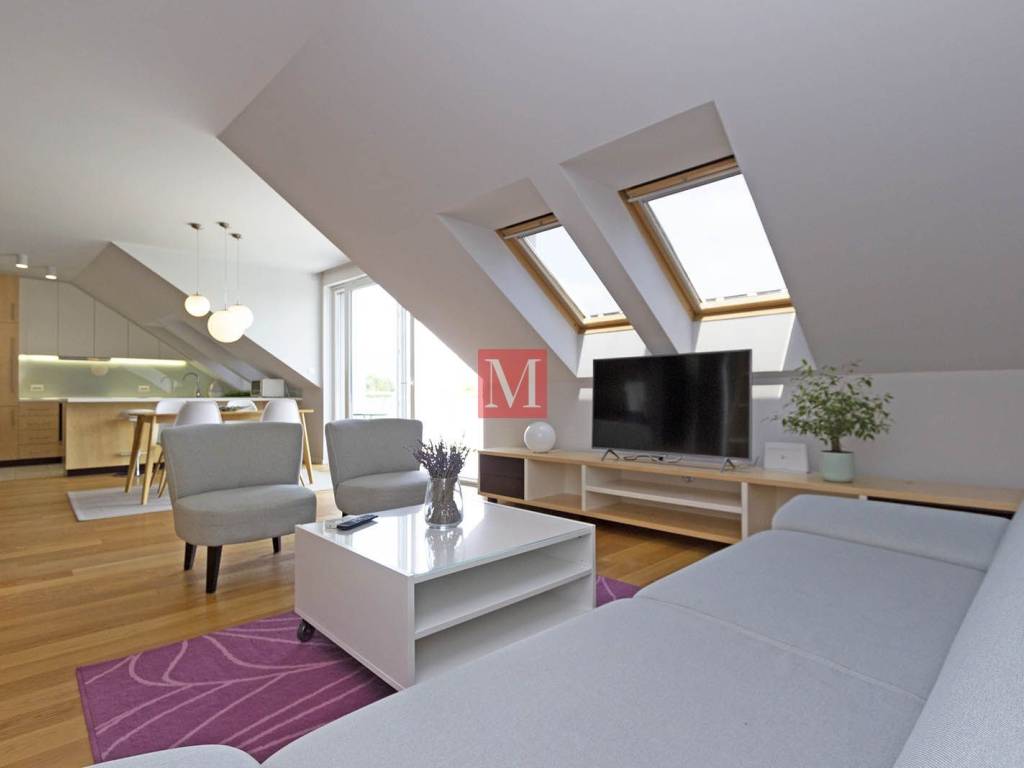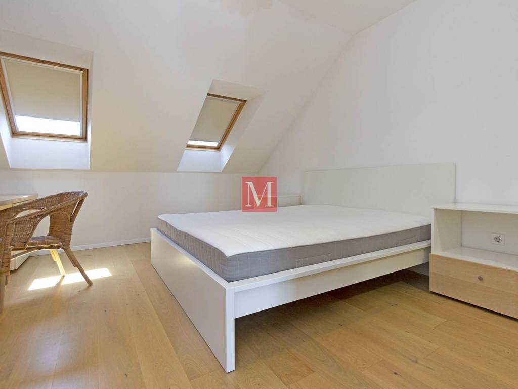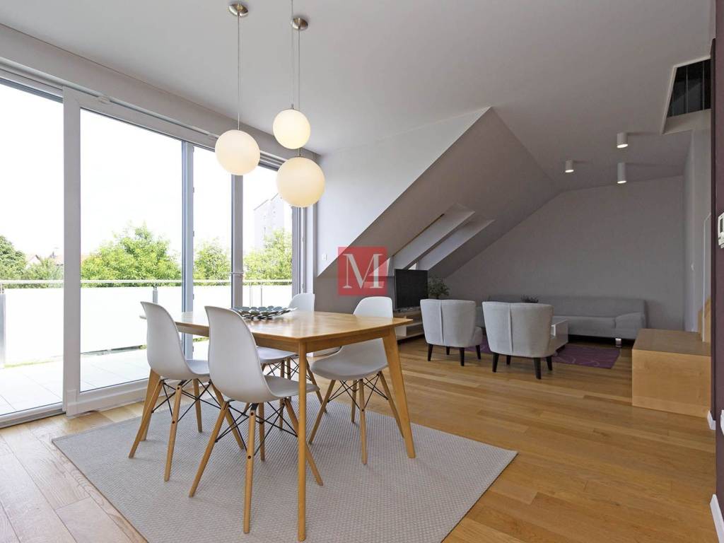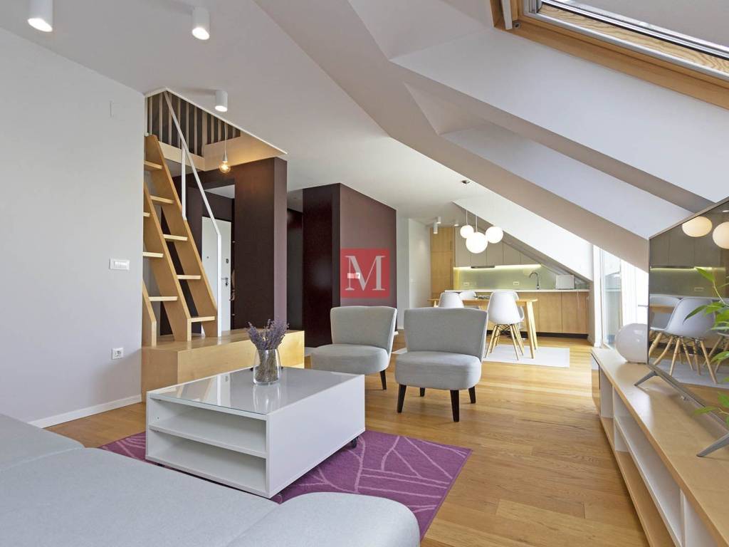 Lovely, modern, designer duplex apartment on Jarun, in a quiet street near Zagrebačka avenue. The apartment consists of a spacious living room with kitchen, dining room and exit to the terrace, two bedrooms, 2 bathrooms. On the upper floor is a large open space that can be used for various purposes. The apartment comes with 1 parking space in the yard and a storage (6m2) in the basement. Energy certificate: class B. Exclusively long-term lease with a mandatory deposit. Agency commission: 1 month rent + VAT.