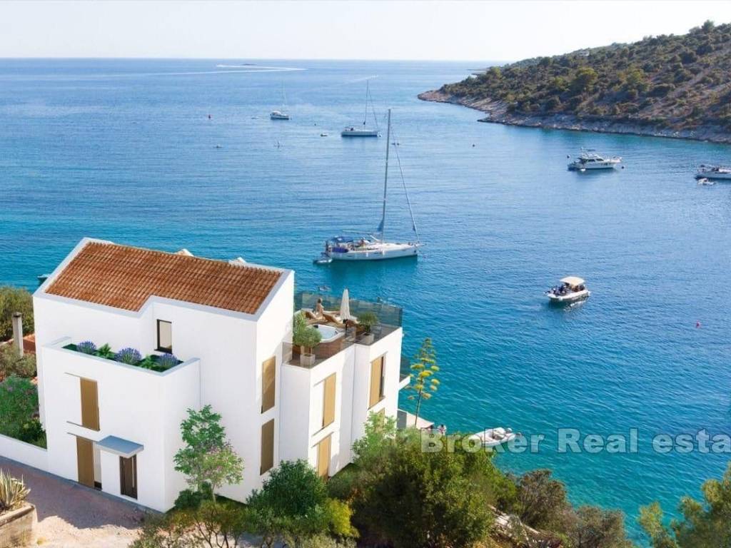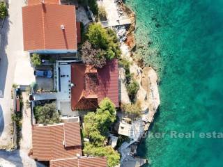 An apartment house is for sale, located in a smaller tourist settlement near Rogoznica. Built on a plot of land with an area of 550 m², it consists of 300 m² of living space, with a total of 4 apartments, two of which are three-bedroom and two are one-bedroom. This is an ideal location for those who want to enjoy unspoiled nature while being right by the sea, with direct access to a beautiful and natural rocky beach and a boat dock. A building permit has been obtained for the property, allowing the object to be further expanded and reconstructed up to a size of 400 m². In this case, the property could be transformed into a boutique hotel with a total of 7 one-bedroom apartments, one of which would be a penthouse with a rooftop terrace. It is also possible to reconstruct the house within the existing dimensions without the need for additional permits. In addition to offering rental apartments, the property also provides the opportunity for commercial use, including hospitality activities such as a restaurant on the part of the property that is not part of the house. The space is adapted and equipped for such activities, making it ideal for a combination of tourist accommodation and business purposes. All of the above opens up potential for the future owner to explore various additional possibilities that this property offers. Nearby, all essential amenities are present, with Split Airport located 21 km away by air and one of the largest marinas in the vicinity. The center of Rogoznica is 7 km away by air, and the center of Trogir is 16 km away by air. There is also a boat dock, further expanding the existing offer. Located in an excellent micro-location, the property enjoys all the advantages of its outstanding position, providing easy access and visibility, which are crucial for successful business operations and attracting guests.