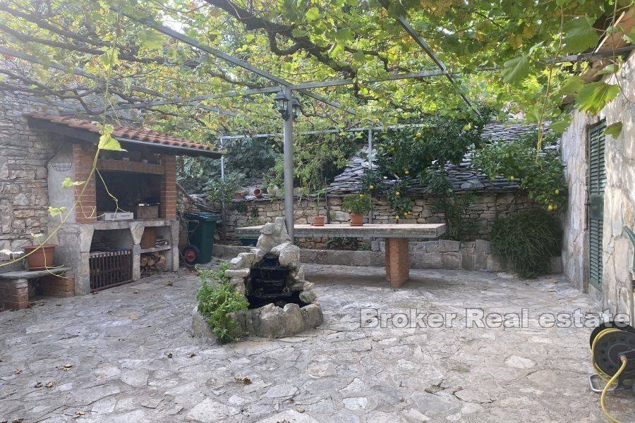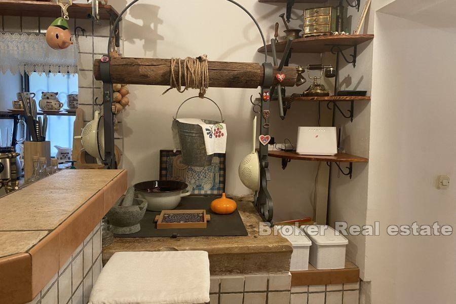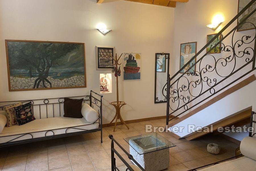 An attractive and stylishly decorated house on the island of Šolta for sale. The property is located in the center of a small, quiet place, and consists of 346 m2 total living space, and extends over a plot of land of 220 m2. It is spread over 3 floors and has an additional terrace with a 360-degree view. Right next to the entrance there is a large covered terrace with fireplace, stone table and chairs, which is a real rarity in places like this where the houses are crowded together. On the ground floor there is a large apartment consisting of a living room, kitchen, dining room and bedroom, bathroom and storage room. There is a large two-story apartment on the first and second floor. The lower floor consists of a living room, a dining room, a kitchen, a bathroom and a laundry room. On the upper floor there are 3 bedrooms and one additional room that can be converted into a bedroom if needed. The house also has an additional room on the roof of the house and an exit to the terrace with an unobstructed view of the surroundings. The property is located near shops, restaurants, cafes and schools. Equipped with top quality furniture and everything necessary for everyday life.