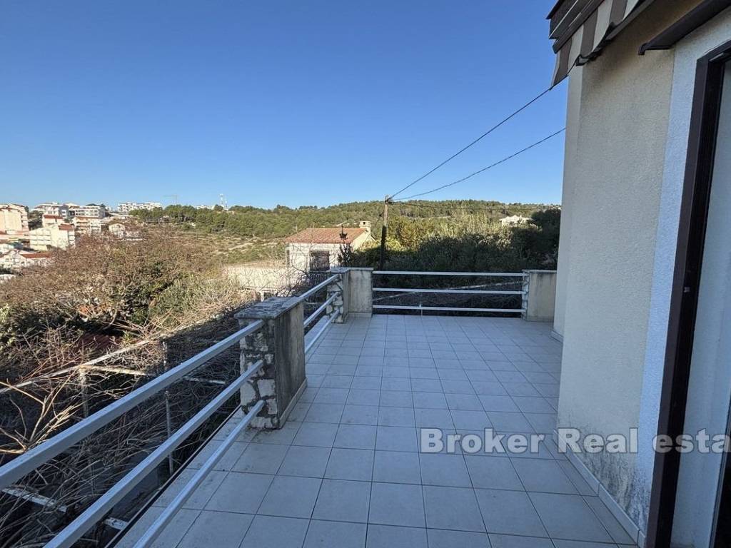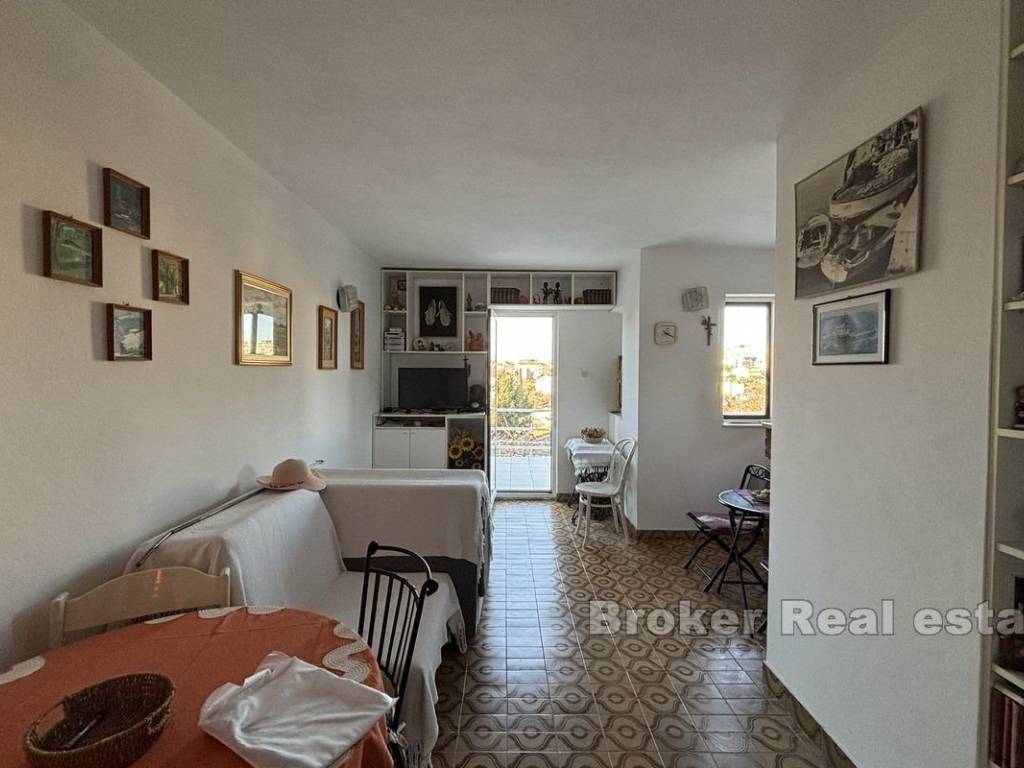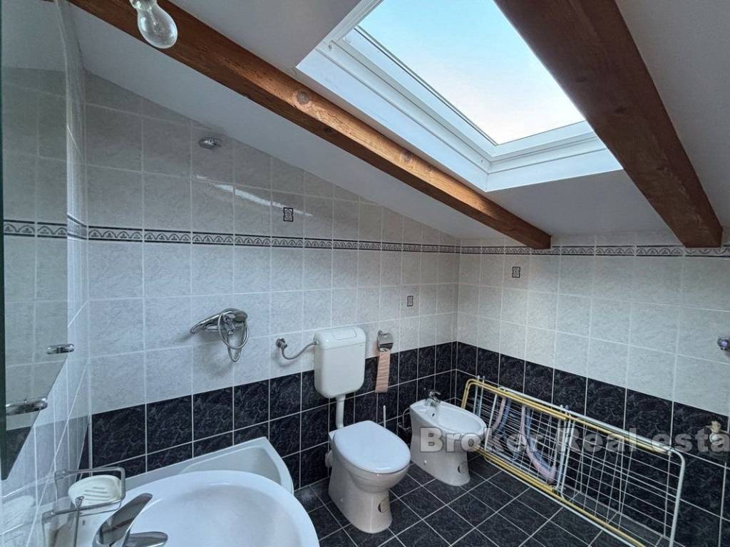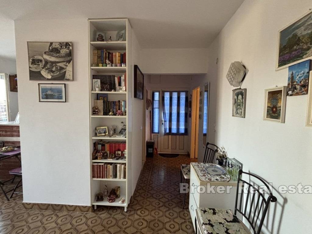 For sale is a smaller family semi-detached house with sea view. It is located on the south side of the island of Čiovo and extends over three floors. The property is west oriented and is located very close to the beach.   On the ground floor there is a summer kitchen of about 20 m² in front of which there is a spacious terrace, and on the first floor there is a two bedroom apartment of about 50 m² with its own terrace. In the loft there is an airconditioned studio apartment of 47 m² with access to a terrace with sea view. The entire property is sold furnished and equipped and it needs to be partially renovated. There is a parking lot behind the house, and the house is adorned with a Mediterranean garden.   The property is an excellent choice due to its proximity to the sea and other facilities that are available during a summer vacation. The airport is only 9 km away.
