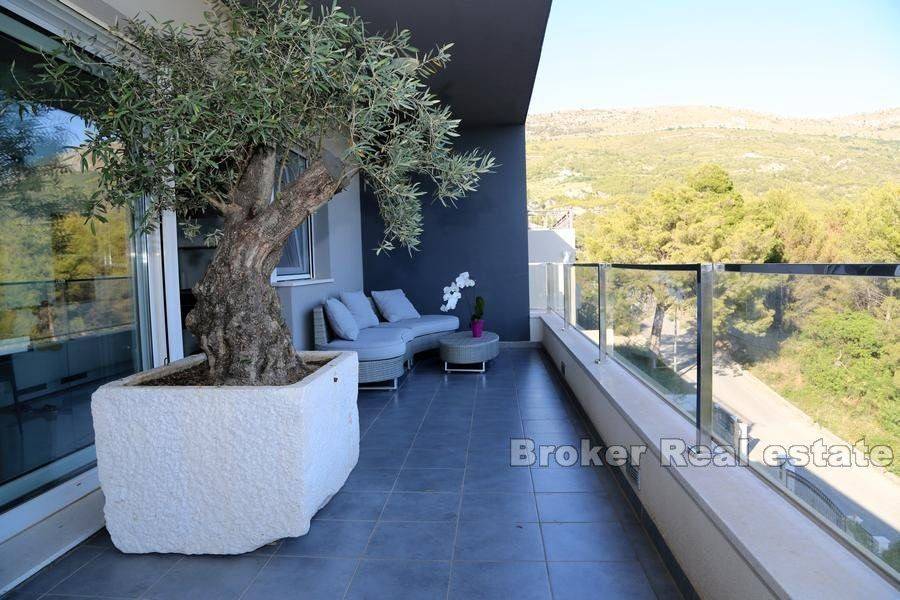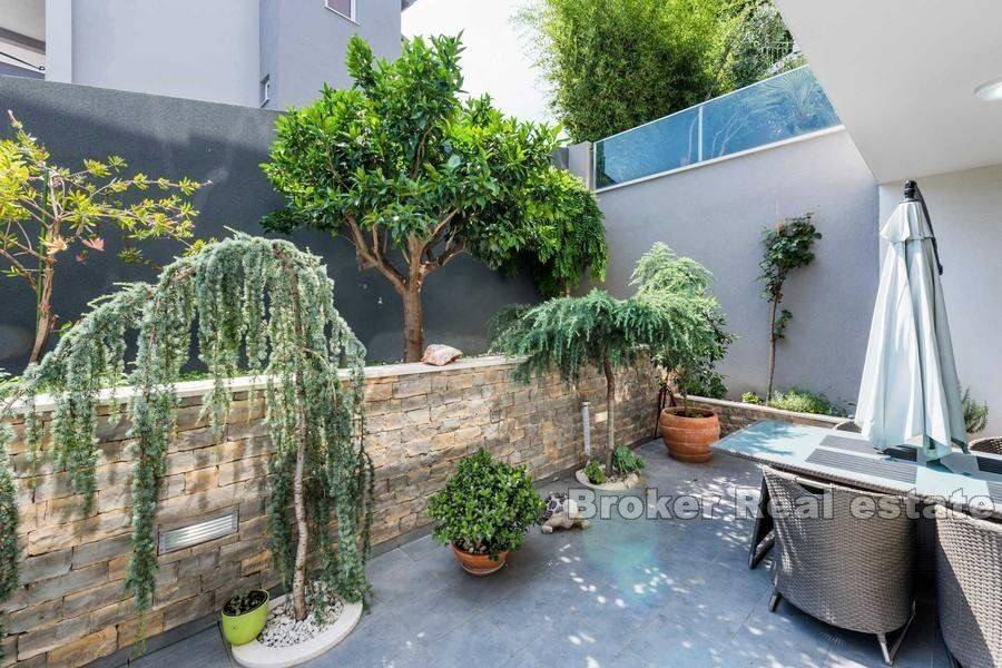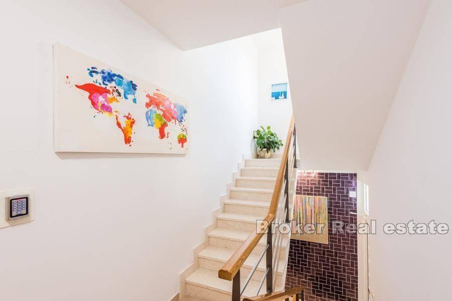 Beautiful apartment house is for sale, fully decorated and furnished. The house is newly built on a plot of 550m2 with a living area of 700m2. It is located in the Split suburbs 7km air distance from Split, and is well connected. The distance of the house from the sea, beautiful pebble beach and rich tourist content is 500m and offers a beautiful view of the sea and islands. The house is built on 4 floors and has a total of 9 accommodation units, of which two are one-bedroom apartments, four studio apartments, three rooms with mini kitchen and one luxury penthouse. All units are equipped with quality and modern materials and furniture, are air conditioned and regularly maintained. The units have a balcony, loggia or a spacious terrace. The house also has a solar heating system with heat pumps, a satellite system and smart cards to enter each unit. The exterior is beautifully landscaped, features a nice cultivated garden with automatic irrigation system, an outdoor heated pool with the possibility of closing located in the backyard, thus providing privacy, a sun deck with sun loungers located next to the pool and an outdoor shower. The house also has a study, engine room, garage and a large parking lot with 9 parking spaces. In addition, the house also has a well-established rental business, and is categorized with four stars and highly rated on all rental portals, which makes it an extremely good opportunity for investors and those who would like to continue the rental business. The house offers a number of possibilities, it is well positioned and as such is suitable for families as well as for investors.