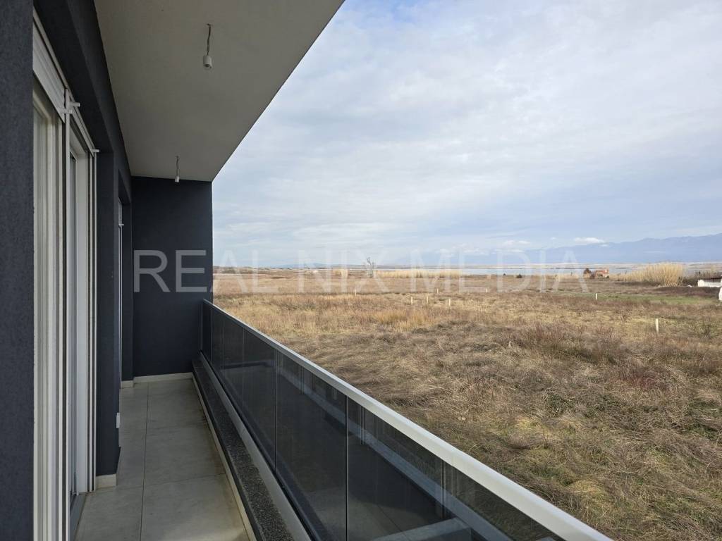 Novoizgrađeni apartman na prvom katu zgrade kojeg sačinjava kuhinja, blagovaonica i dnevni boravak sa izlazom na prostranu terau, dvije spavaće sobe, kupaonice i wc-a. Apartmanu pripada ostava u prizemlju zgrade te dva vanjska parkirna mjesta. USELJIVO ODMAH! Zgrada se nalazi na izuzetno mirnom predjelu mjesta te se sa terase i iz jedne spavaće sobe pruža pogled na more. U svakoj prostoriji nalazi se klima uređaj, te podno grijanje u kupaonici, dnevnom boravku, blagovaonici i kuhinji. Kvalitetna gradnja: termoizolacija stiropor 8 cm, PVC stolarija sa roletama i komarnicima, podne obloge u spavaćim sobama: laminat, preostali dio stana pločice.