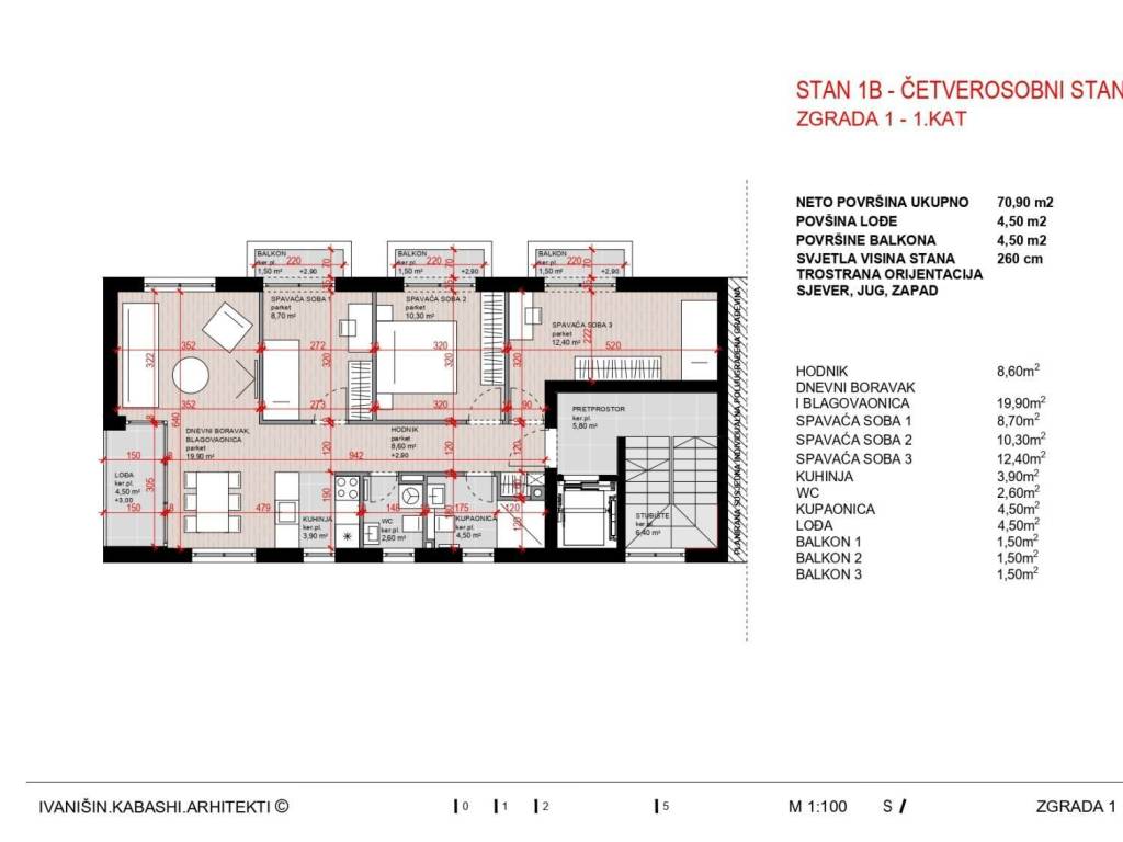 Četverosobni stan površine 70,90m2 + 4,6m2 lođa + balkoni 4,50m2