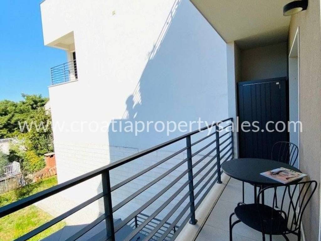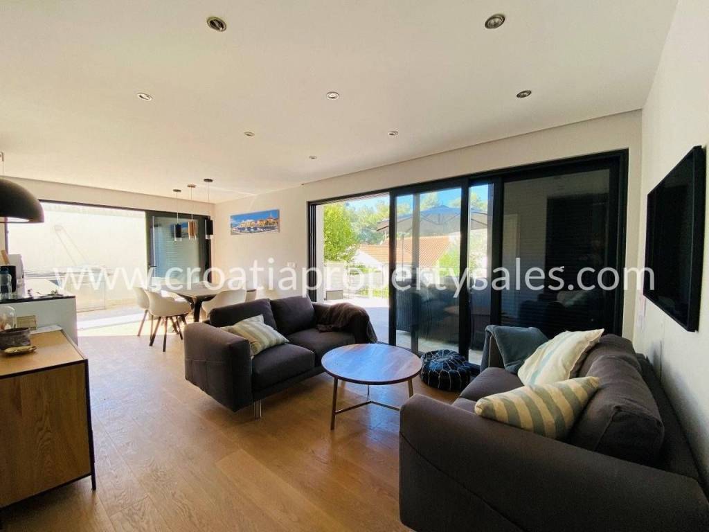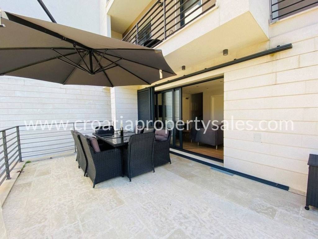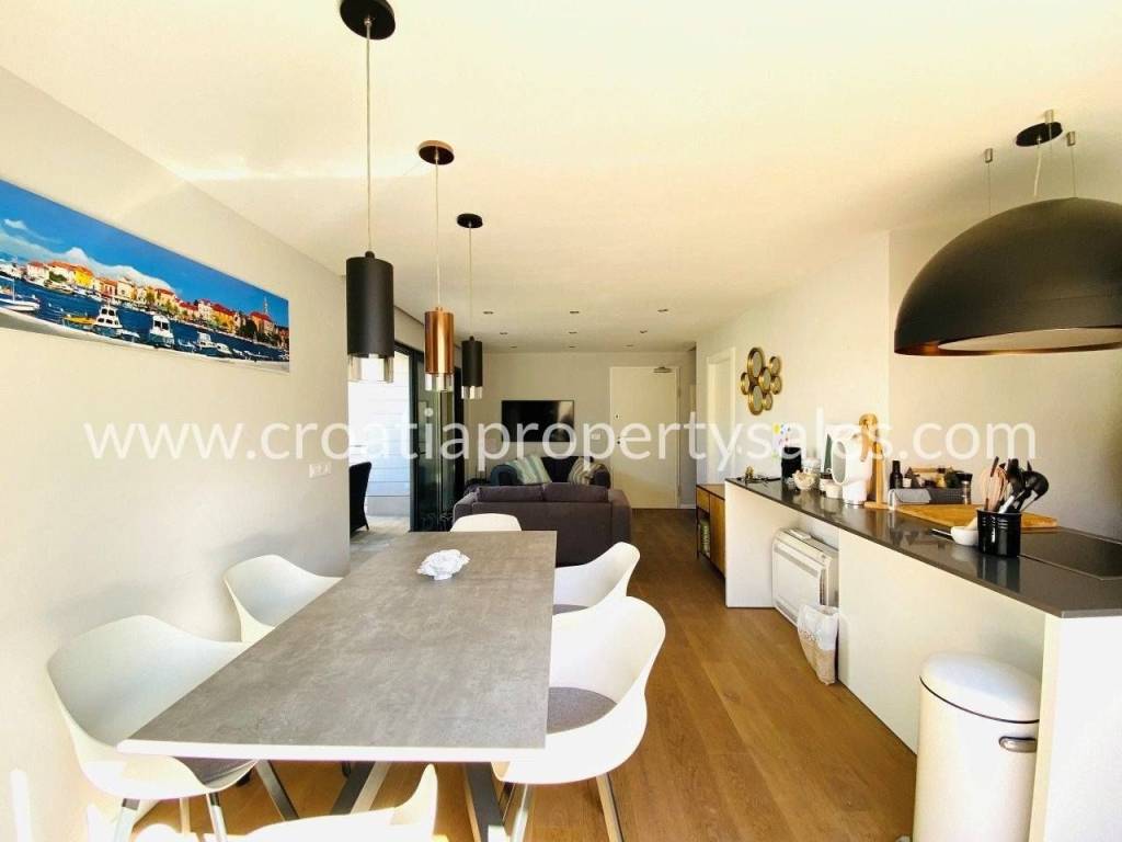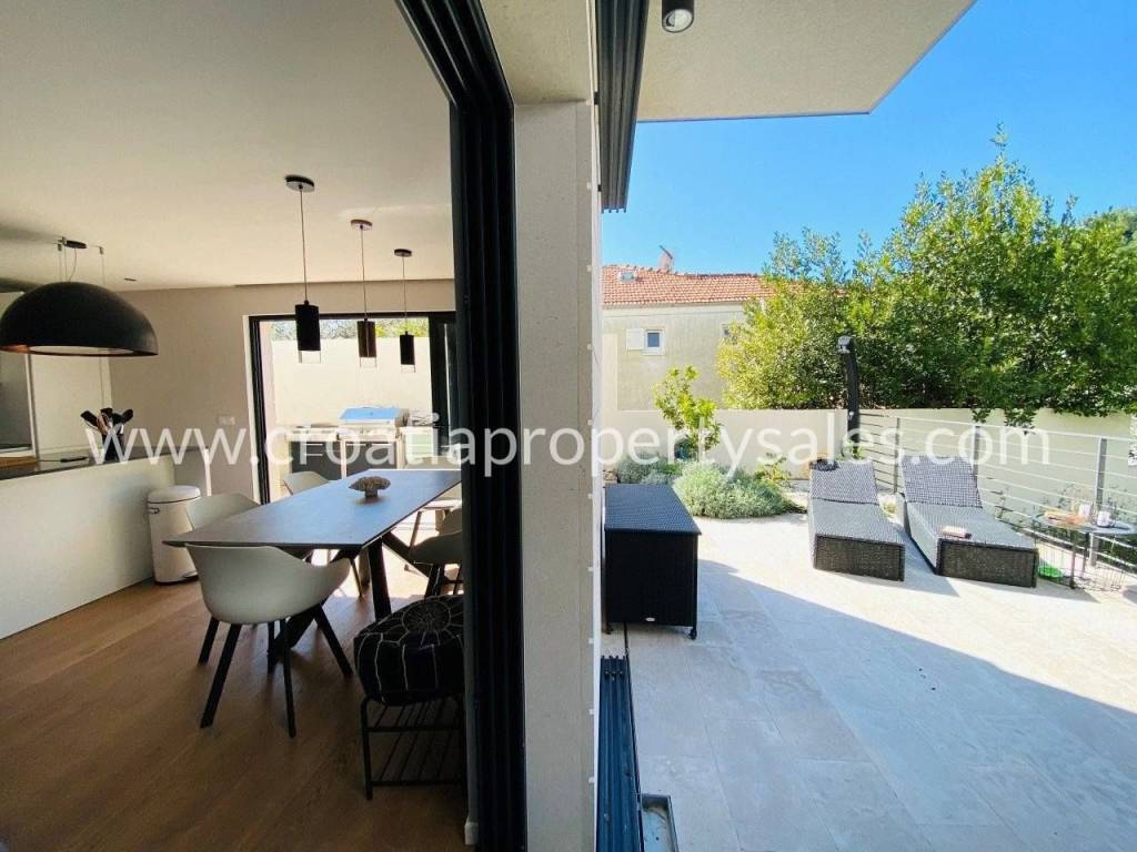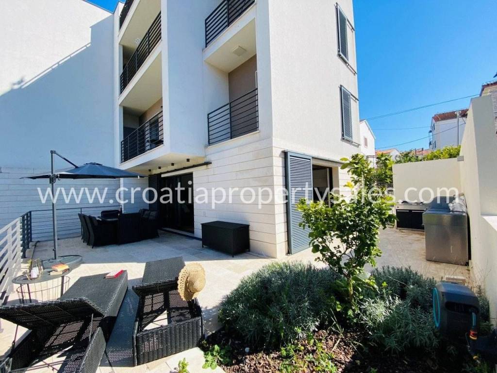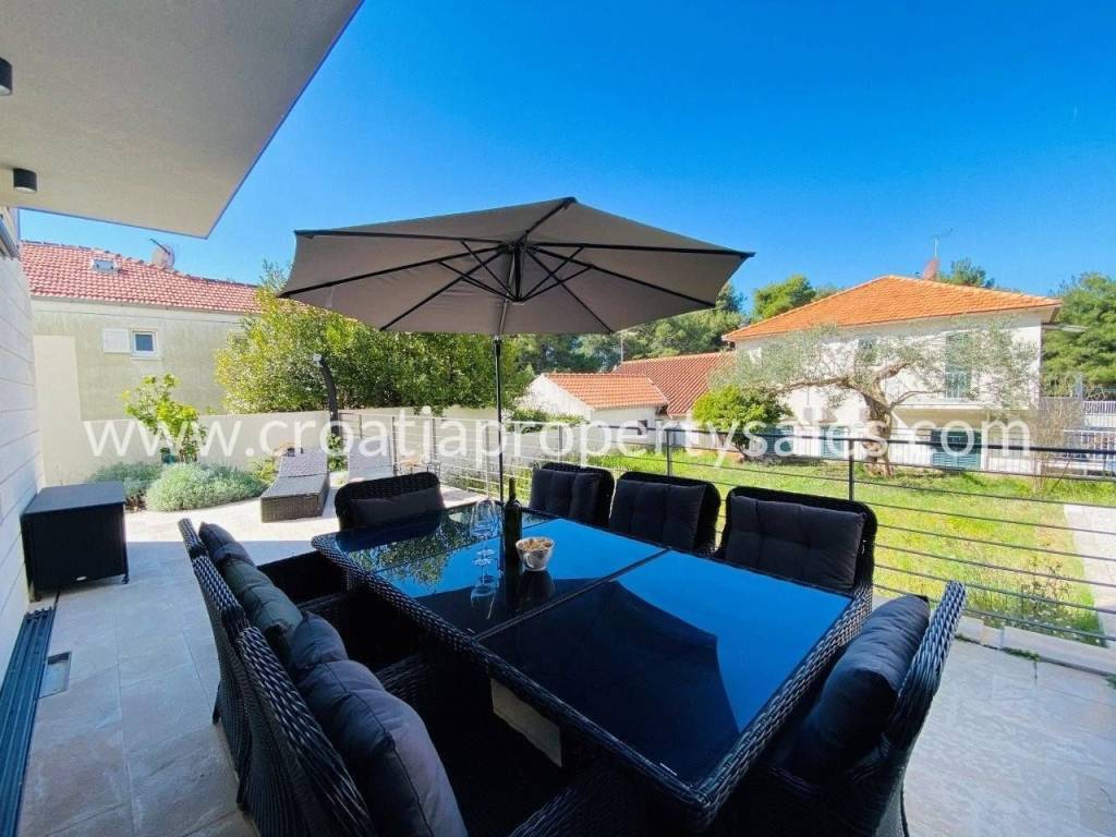Attractive apartment in a modern, recently built building, located just 200 meters from the sea and the popular beach.In a prime location in a quiet part of town.The 107 m2 apartment offers a modern and functional layout. It extends over two floors and consists of three bedrooms, a bathroom with shower, toilet, open-concept kitchen, dining room and living room and a spacious terrace.Since the terrace and outdoor area are spacious, there is enough space for a large outdoor table with 8 chairs, deck chairs, a parasol, an outdoor shower and at the very beginning there is a quality outdoor kitchen, from the top Italian brand Steel Cousine, which is ideal for relaxing outdoors and enjoying the Mediterranean ambiance since it contains a grill, sink, wine cooler and ice maker.The storage room is located in the basement. The apartment has one outdoor parking space. It is being sold fully furnished.This is a stylish apartment, designed and decorated to extremely high standards, offering a modern and sophisticated living experience.The large terrace, along with luxurious amenities, is ideal for entertaining family and friends, making it a special feature for potential buyers, while also being an ideal choice for those looking for a comfortable and modern living space close to all necessary amenities, while also wanting to enjoy the peaceful and green island surroundings.