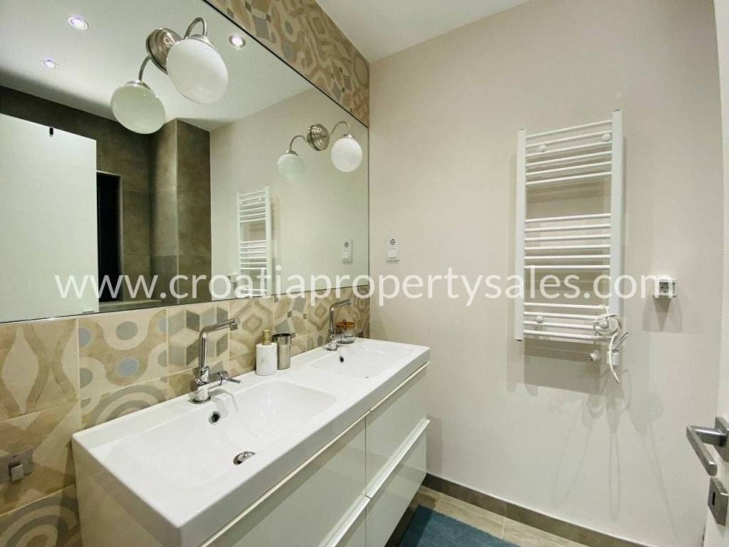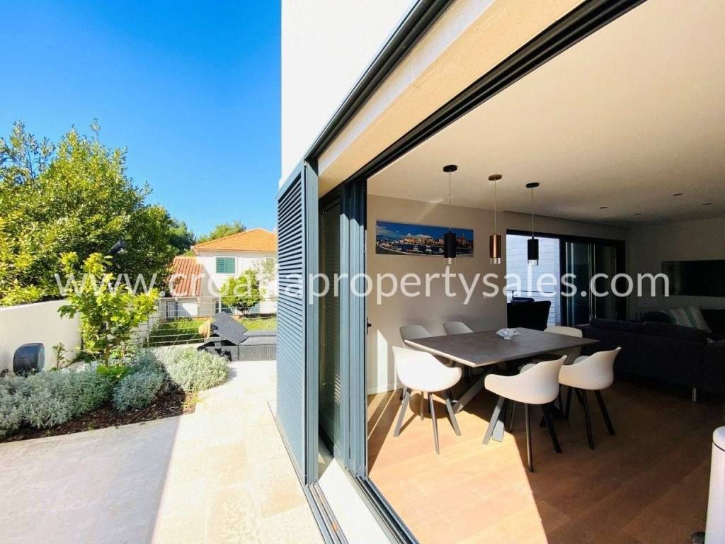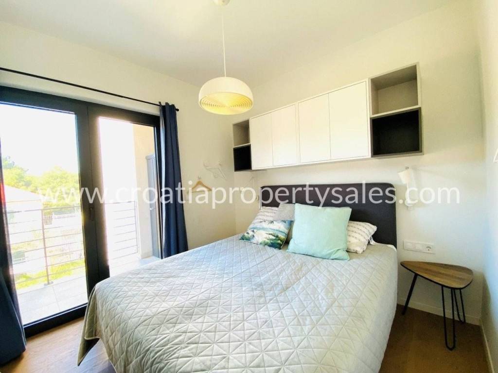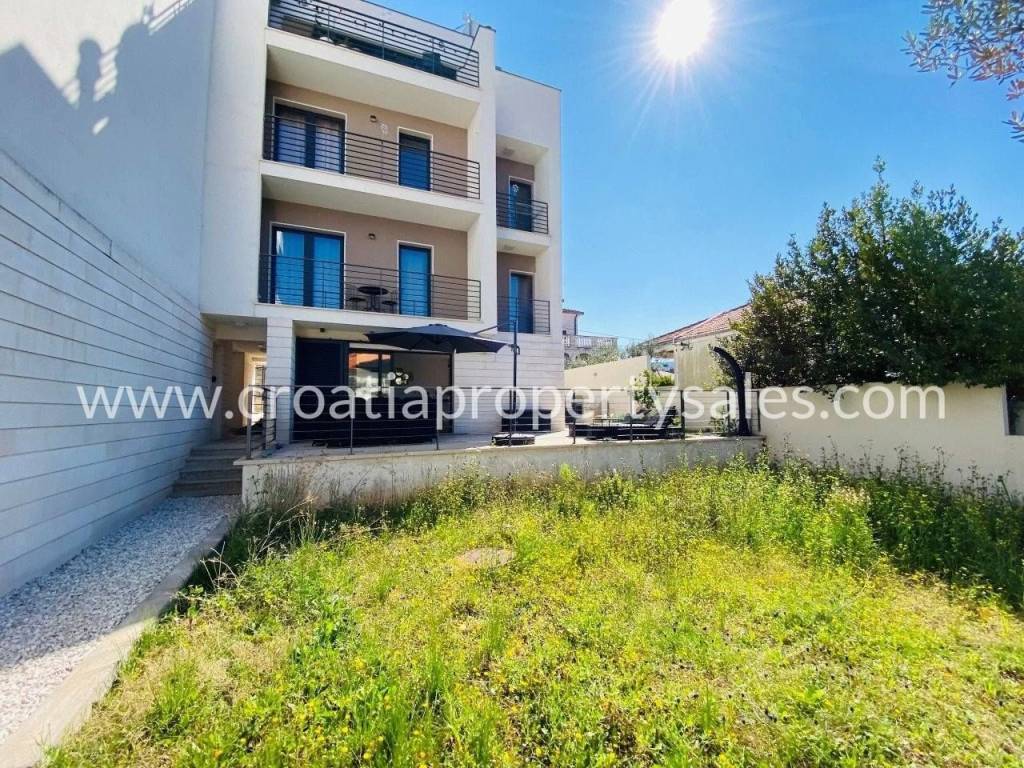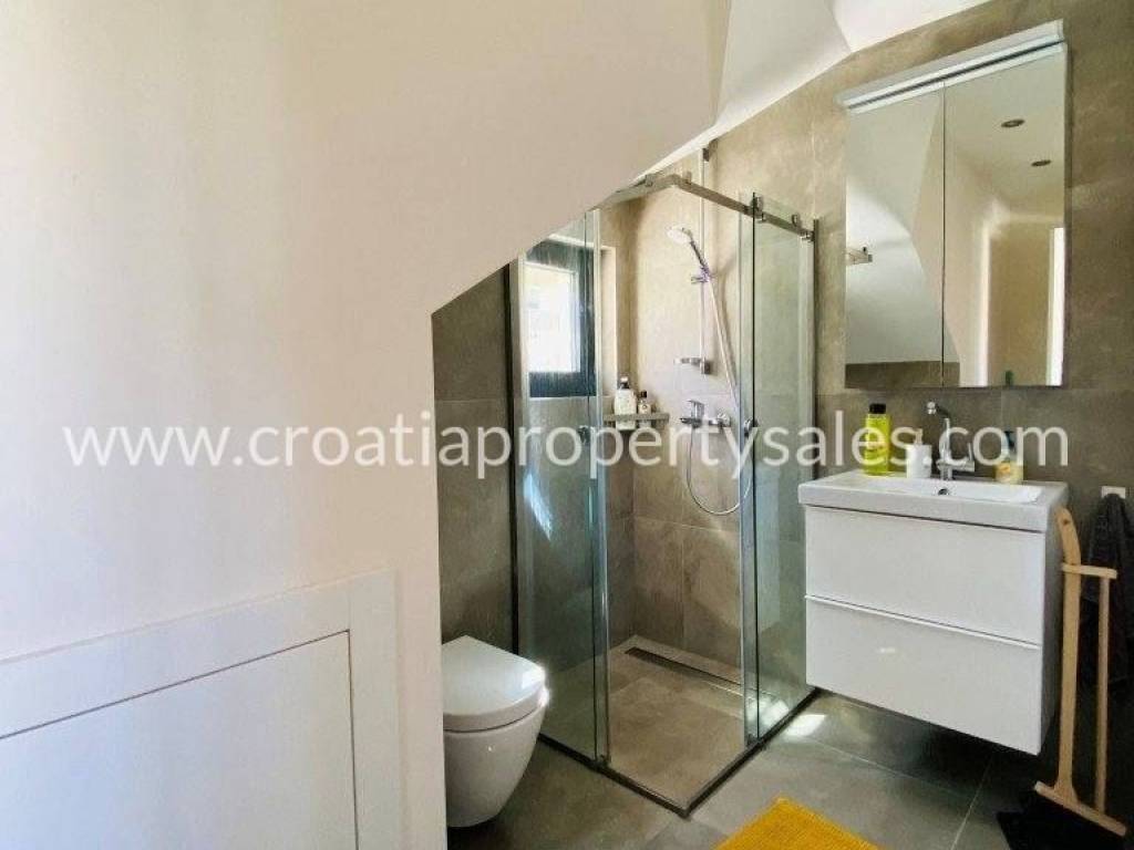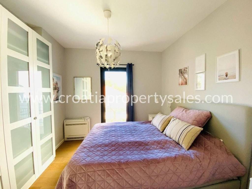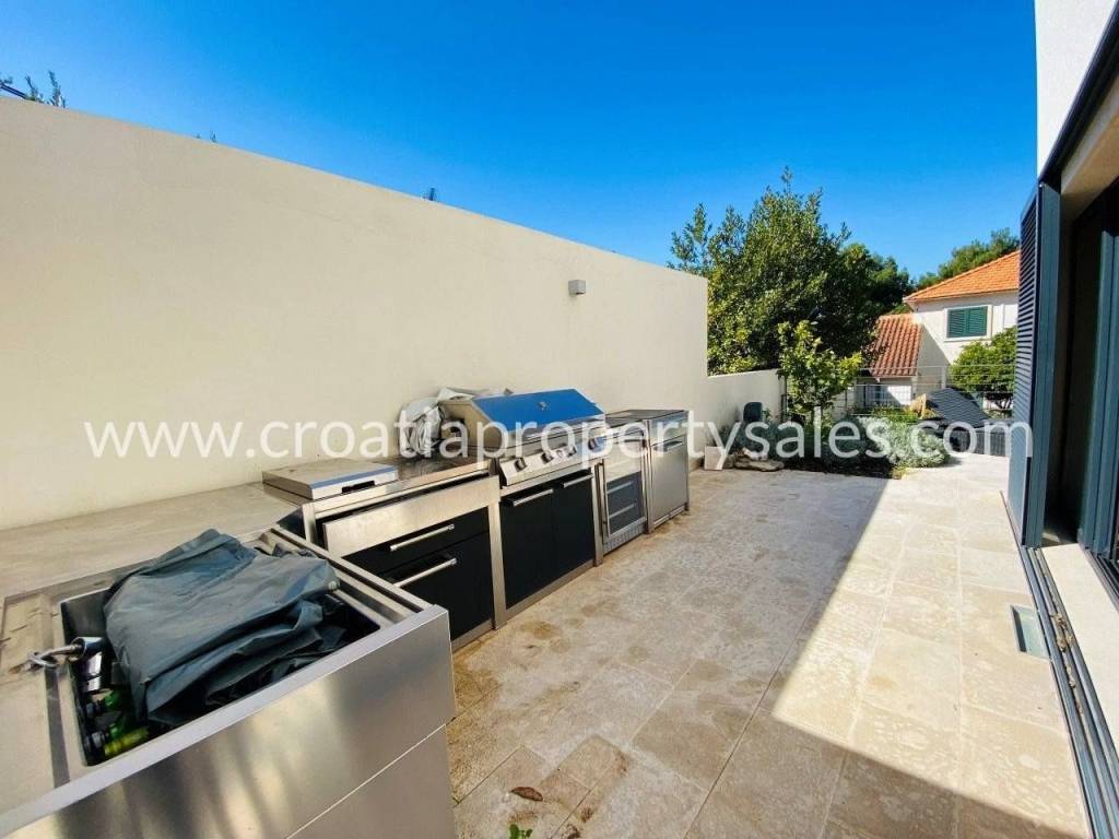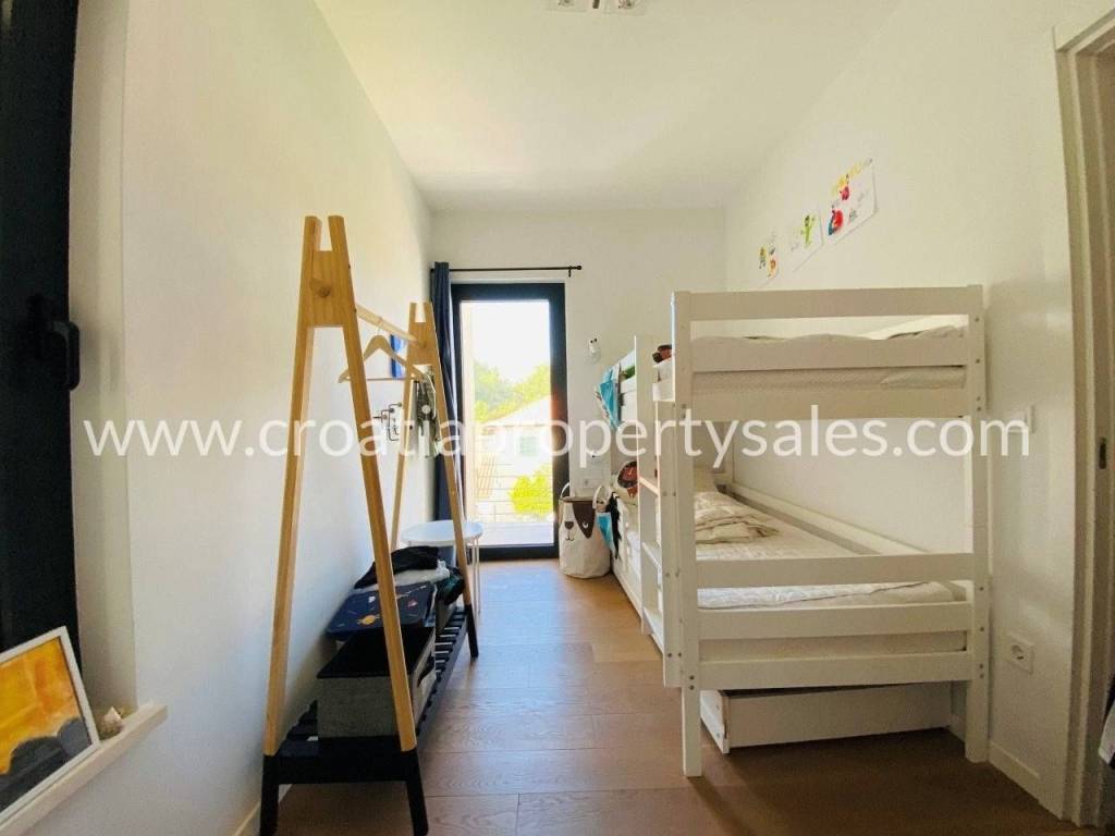 Attractive apartment in a modern, recently built building, located just 200 meters from the sea and the popular beach.In a prime location in a quiet part of town.The 107 m2 apartment offers a modern and functional layout. It extends over two floors and consists of three bedrooms, a bathroom with shower, toilet, open-concept kitchen, dining room and living room and a spacious terrace.Since the terrace and outdoor area are spacious, there is enough space for a large outdoor table with 8 chairs, deck chairs, a parasol, an outdoor shower and at the very beginning there is a quality outdoor kitchen, from the top Italian brand Steel Cousine, which is ideal for relaxing outdoors and enjoying the Mediterranean ambiance since it contains a grill, sink, wine cooler and ice maker.The storage room is located in the basement. The apartment has one outdoor parking space. It is being sold fully furnished.This is a stylish apartment, designed and decorated to extremely high standards, offering a modern and sophisticated living experience.The large terrace, along with luxurious amenities, is ideal for entertaining family and friends, making it a special feature for potential buyers, while also being an ideal choice for those looking for a comfortable and modern living space close to all necessary amenities, while also wanting to enjoy the peaceful and green island surroundings.
