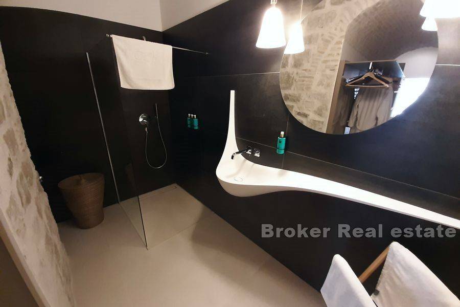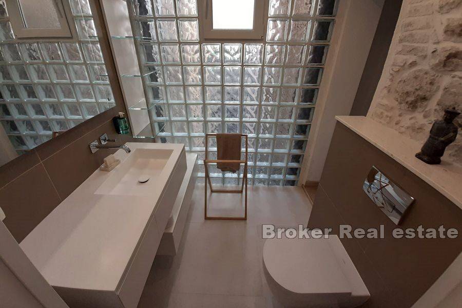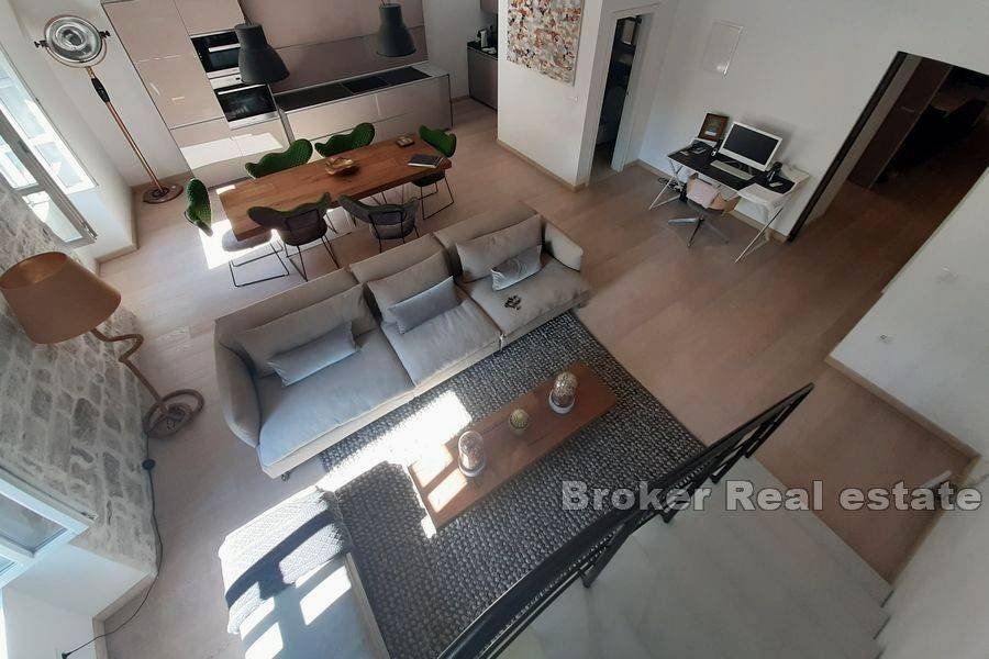 Luxury apartment for long term rent, located in the center of Split, total living area of 120 m2. The apartment is located in a house with a closed private yard, is luxuriously decorated and elegantly furnished, and is a great choice for business people looking for privacy and peace. The apartment consists of an entrance with stairs leading to the living room and an open plan kitchen, from where the stairs lead to the gallery where there is a bed for guests. In the living room there is a small auxiliary toilet. The other part of the apartment is separated by a partition door and it has a bedroom and a spacious elegant bathroom through which it is possible to walk around. The elegance of the apartment is visible in the original antique arches that dominate this part of the property. An excellent offer in the center of Split that will not leave anyone indifferent.