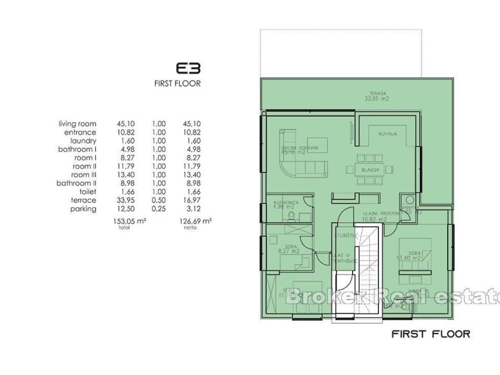 Apartments in the first row to the sea located in a small town near Zadar. On a plot of 722m2 is a newly built residential building that spreads over three floors – ground floor and two floors. The apartments are located on the first and second floor of the building. The apartment on the first floor of 130m2 consists of a kitchen with dining room and living room, one bathroom and three bedrooms, one of which has a bathroom. From the living room there is access to a covered terrace of approximately 34m2 which provides an impressive open sea view. The apartment has one parking space. The apartment on the second floor of 220m2 consists of an open concept kitchen, dining room and living room with access to a covered terrace, one bathroom, toilet, pantry and three bedrooms, one of which has an attached bathroom. This apartment has a rooftop terrace with a jacuzzi and a summer kitchen that offers the perfect place to stay in the warmer months. The apartment has one parking space. Excellent macro location, proximity to the city of Zadar and the airport and the immediate vicinity of Croatian national parks and nature parks make this property an ideal place for housing or tourism business. • First floor E3 – apartment of 130 m2 – 762.000 € • Second floor E4 – apartment of 220 m2 – SOLD!