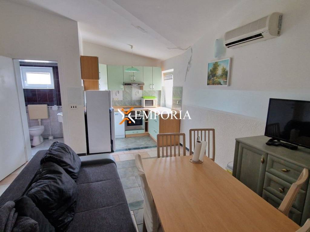 The building is constructed with brick, and the façade is finished with textured styrofoam. The apartment has PVC windows with PVC shutters, ceramic tiled floors, and standard entrance doors. The roof is sloped, there is no chimney, and the apartment is not equipped with a heating system. One air conditioning unit provides cooling. It is sold furnished. There is no outdoor grill. The property is accessible via a public asphalt road and offers a partial sea view.This property on Vir offers a simple and practical solution for summer holidays or occasional stays near the sea.