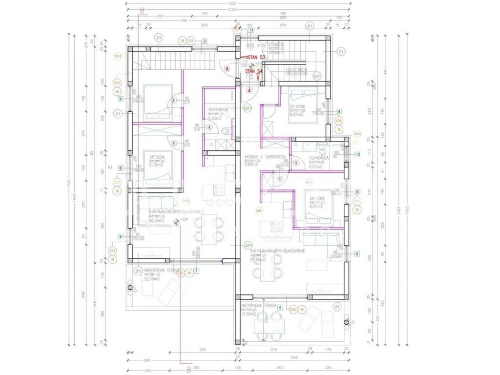 Stan S4 prostire se na dvije etaže. Na 1. katu su 2 spavaće sobe, hodnik s garderobom, kupaonica, dnevni boravak s kuhinjom i blagovaonicom, te natkrivena terasa. Ukupna neto korisna površina 1. kata iznosi 66 m2.