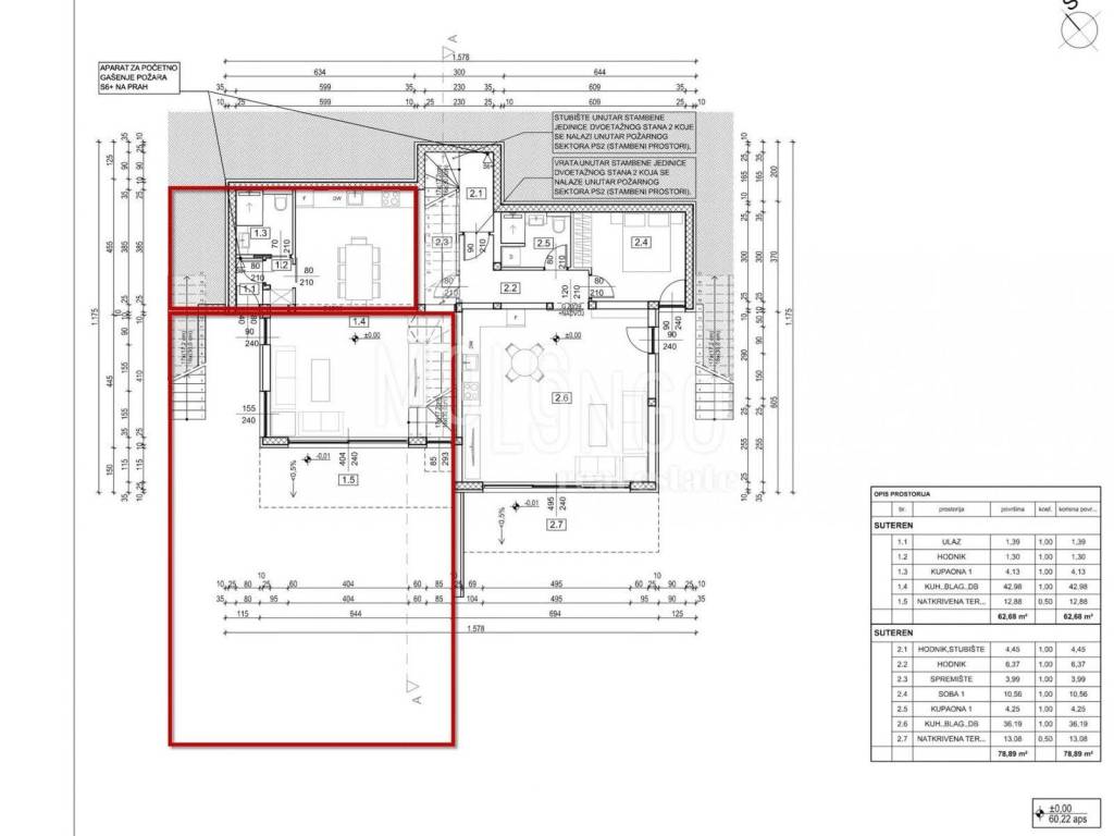 The lower floor consists of a hallway, a bathroom, and an open-plan living room with a kitchen and dining area that extends onto a covered terrace of 13 m². In addition, the apartment includes about 200 m² of outdoor space with private parking spots, a pool, a garden, and other amenities.
