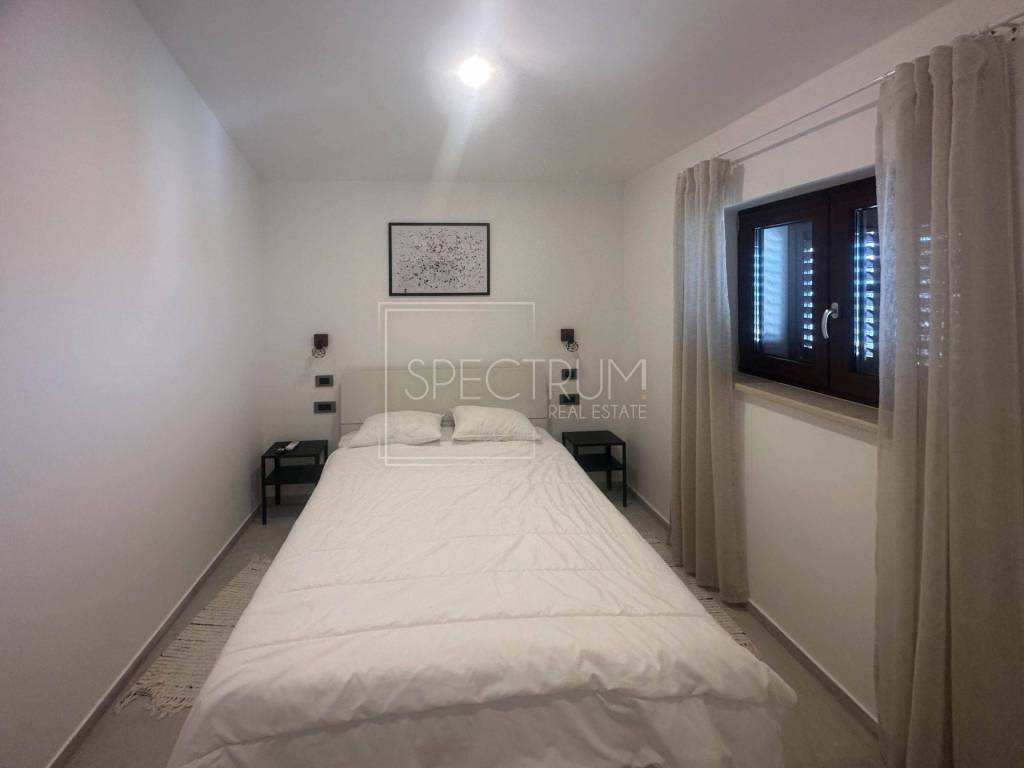 The apartment is located on the 2nd floor of a smaller residential building. The area of the apartment is 58.12 m2. The apartment consists of a spacious living room with kitchen and dining room, 2 bedrooms, hallway, bathroom and toilet. The apartment offers a view of the sea. The apartment is heated by air conditioning, underfloor heating in the bathroom, and there is also the possibility of installing a wood stove. The apartment was completely renovated last year. The apartment is for sale fully equipped and furnished.