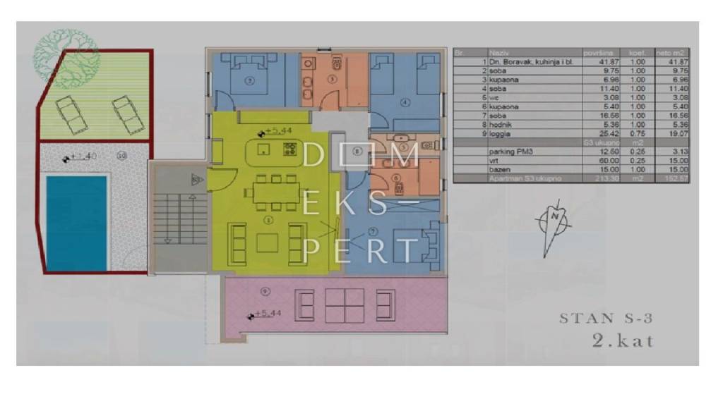 - The total area of the apartment is 127.58 m², including the garden, parking space, and loggia, calculated according to the appropriate coefficients.
