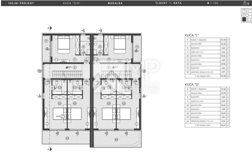 On the first floor (95 m2) there are three bedrooms, each of which has its own bathroom. One bedroom has access to the loggia, while the other two have access to the terrace with a view of the sea.