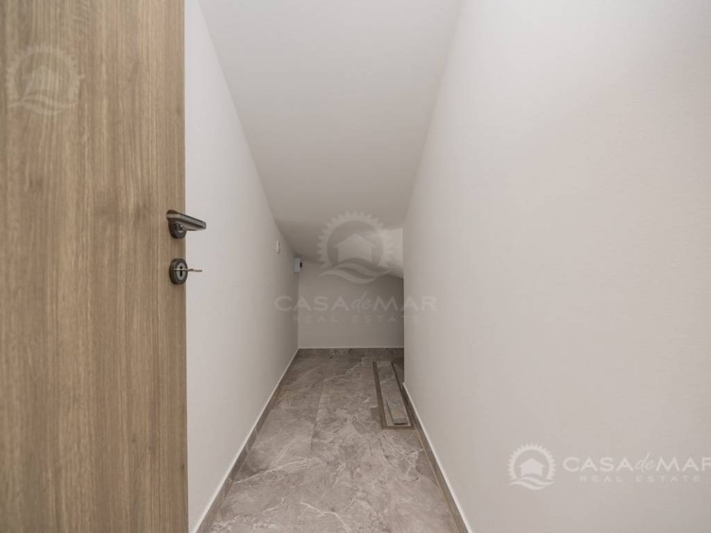 The duplex apartment has a total living area of 90 m², its own private entrance, a garden of 100 m², and one parking space on the shared courtyard of the building. The ground floor features a covered terrace, a spacious living room with dining area and kitchen, a wardrobe, a storage room, and a modern bathroom. Internal stairs lead to the upper floor, where you will find another bathroom, a storage room, and two bedrooms, one of which has its own covered terrace with an incredible panoramic sea view.