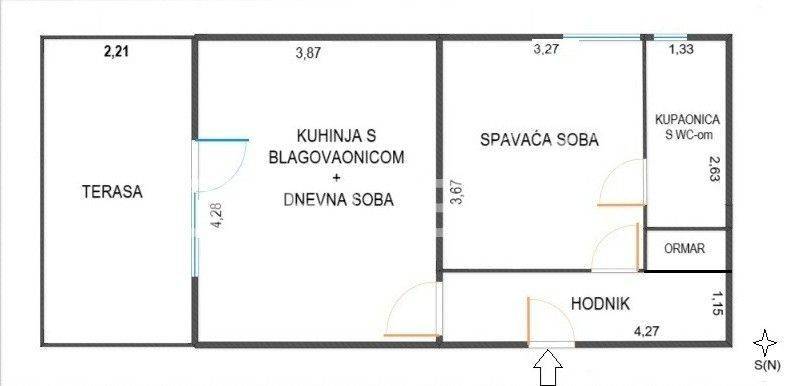Sastoji od ulaznog hodnika s ugradbenim ormarom, kupaonice s WC-om, spavaće sobe, open space kuhinje s blagovaonicom i dnevnim boravkom te s izlazom na terasu/vrt (nisu su upisani u vlasničkom listu).