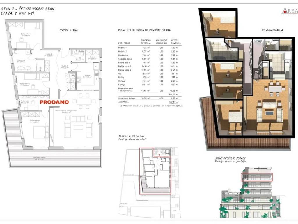 apartment 6/1 floor (+1) = 145.47 m2 + terrace 36.50 m2 + 3 garage parking spaces