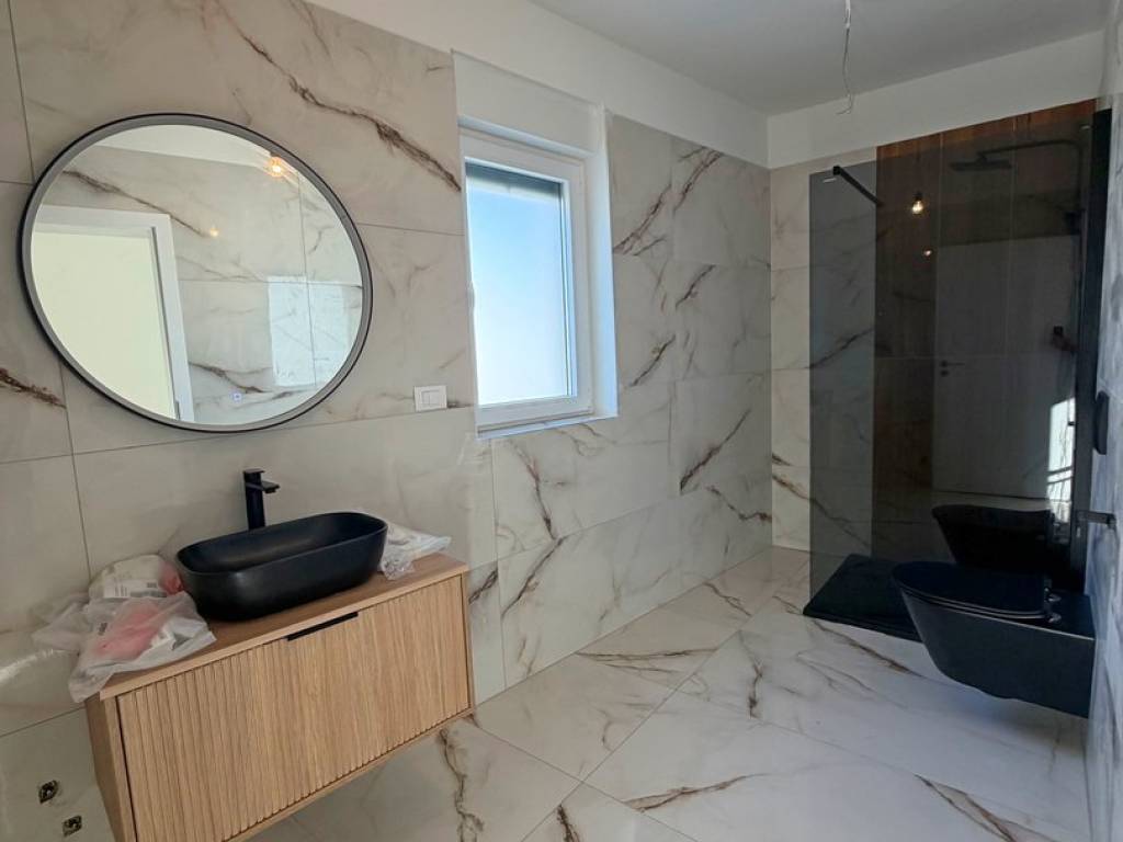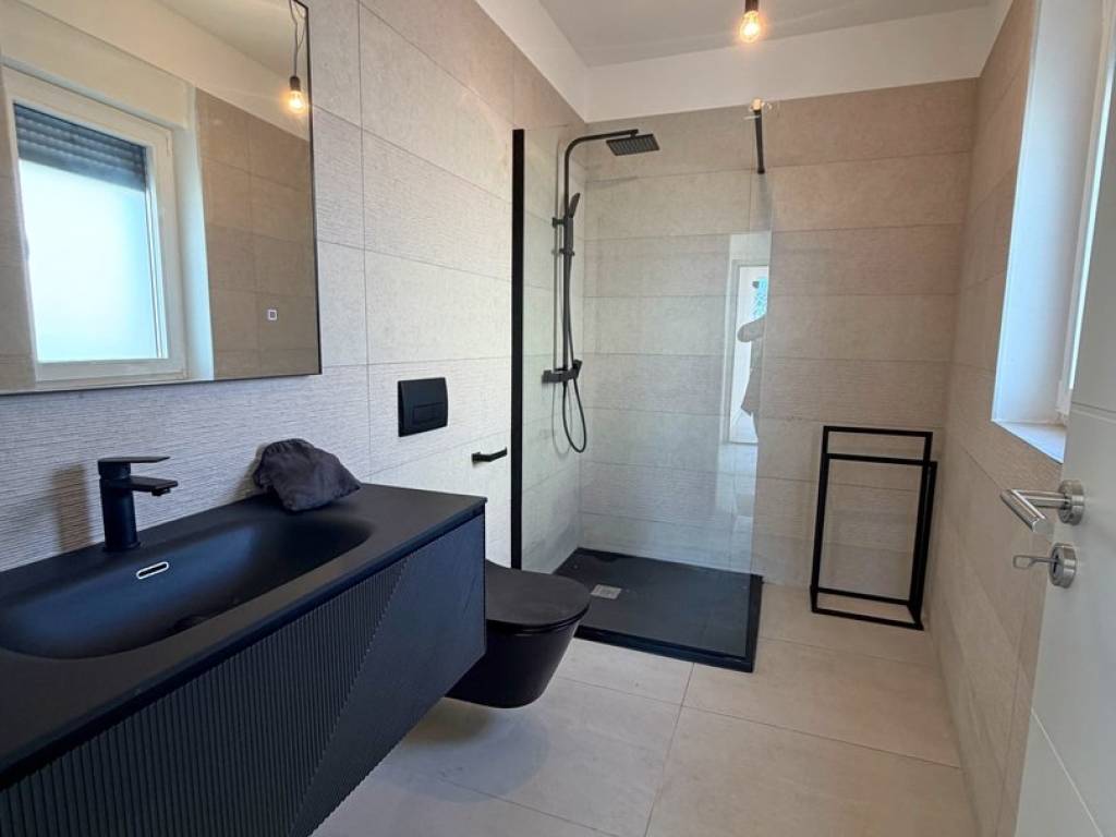 We are selling a modern duplex house with a swimming pool on a beautiful location in Ližnjan. The house has an area of 180 m2, and it is on two floors. The ground floor has an entrance hall, bathroom, storage room, kitchen with dining room, spacious living room with access to a covered terrace and garden with a swimming pool, while internal stairs lead to the first floor where there is a hallway, bathroom, three bedrooms, one of which has a terrace with a sea view. All rooms are air-conditioned. Orientation: East-west-south. Swimming pool size 31.50 m2. 2 parking spaces. Distance from the sea 1.400 meters.