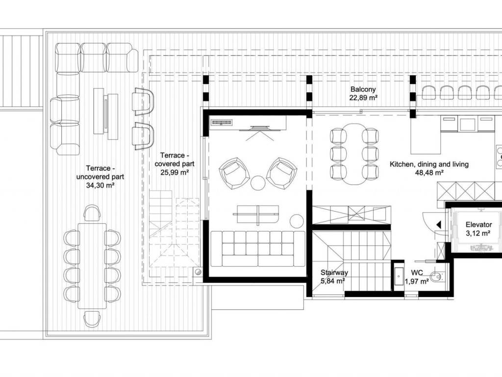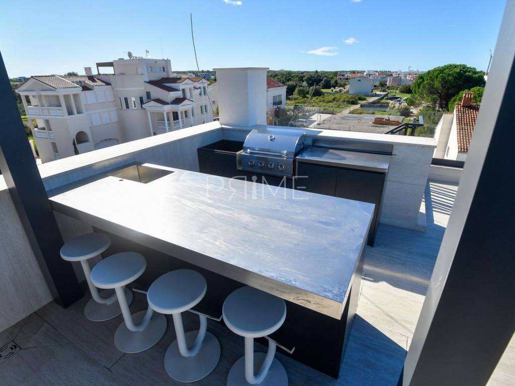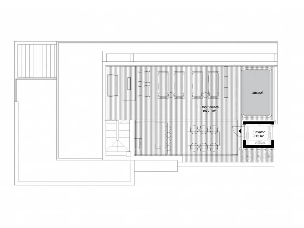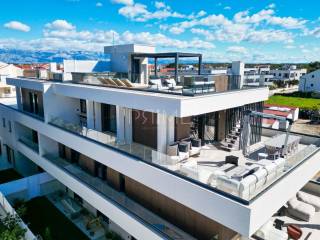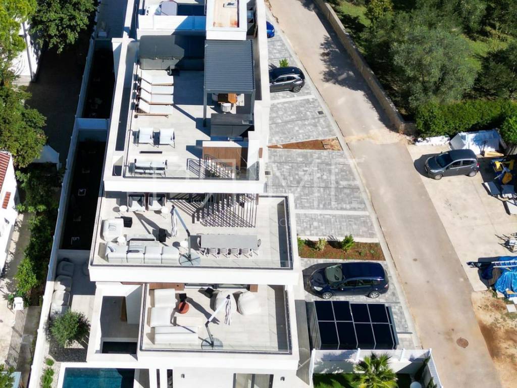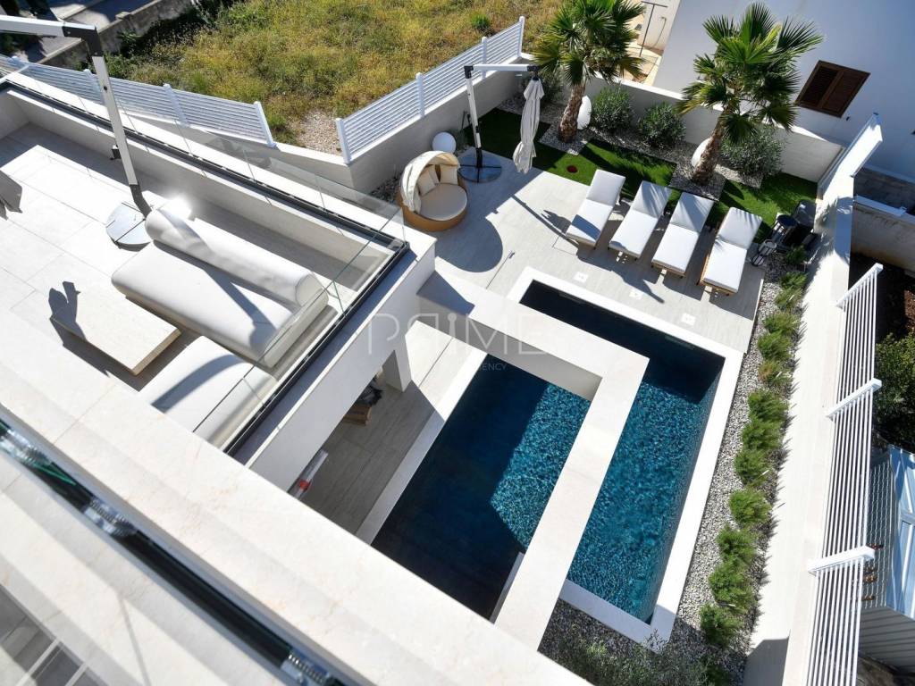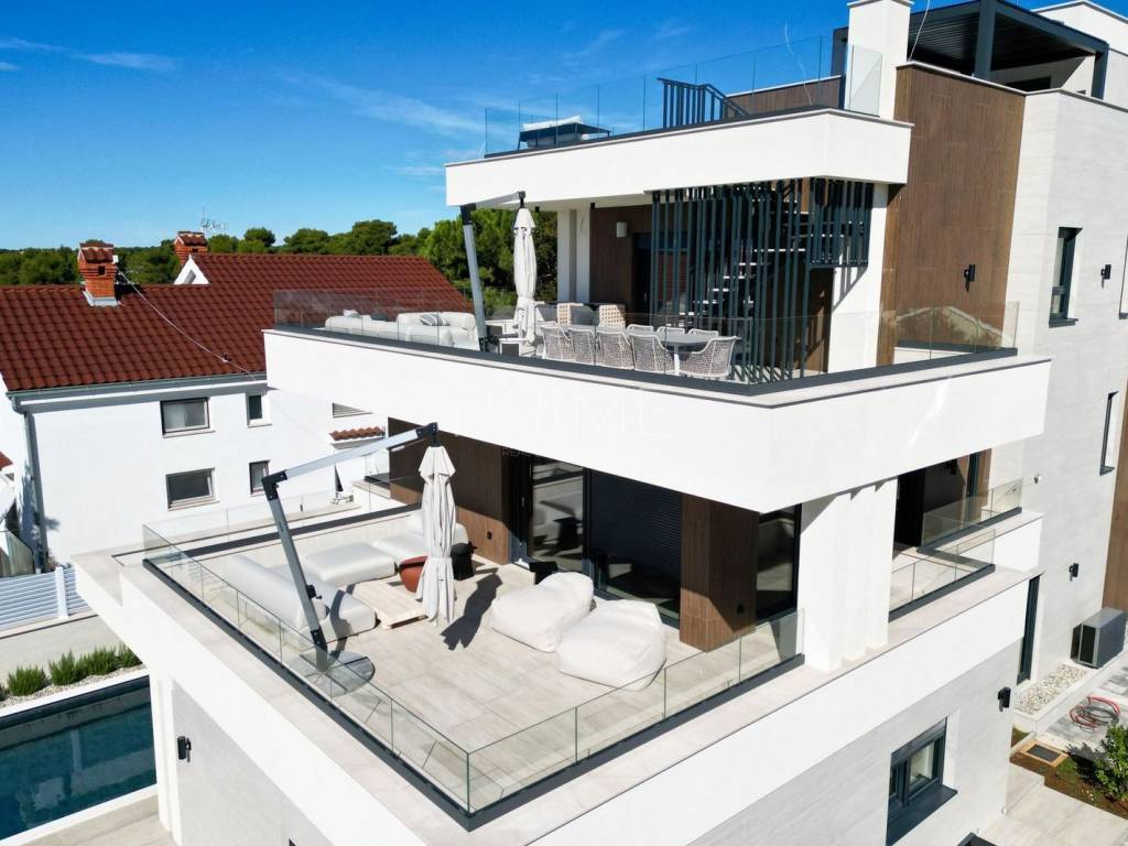 – Stambena površina: 231,84 m²– Ukupna površina s terasama, spremištem, garažom i bazenom: 430,90 m²– 3 luksuzno uređene spavaće sobe– 3 prostrane kupaonice + gostinjski wc– Privatan veliki jacuzzi na krovnoj terasi i više terasa s pogledom na more– Privatni lift izravno u stan– 3 parkirna mjesta (1 zatvoreno) s EV punjačem– Potpuno opremljena kuhinja i praonica– Smart Home sustav (KNX – Siemens/ABB)– Dizajnerski namještaj uključen u cijenu