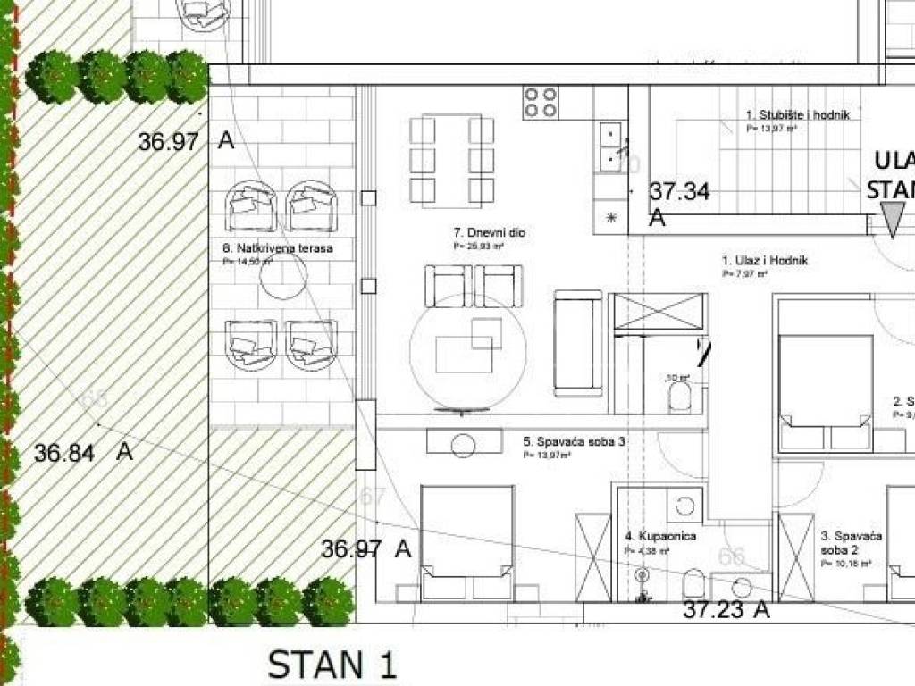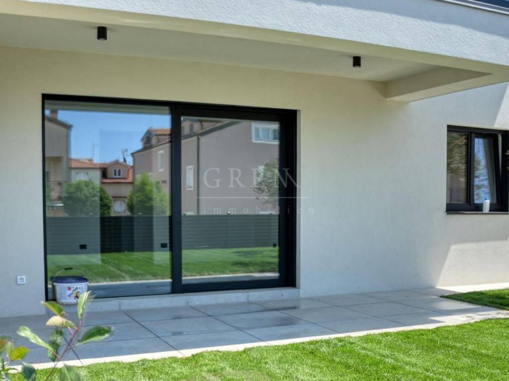 Located near the coast in Poreč, this charming three-bedroom apartment on the ground floor features its own garden. The total net area amounts to 74 m2 + covered terrace of 15 m2. The apartment consists of a spacious living room in an open space concept with a kitchen and dining area, three comfortable bedrooms, a bathroom, and an additional WC.