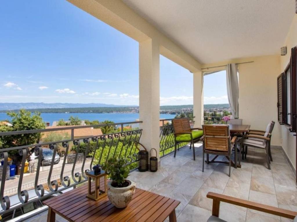 Otok Krk, Malinska, šire područje, prodaja opremljenog dvoetažnog apartmana površine 98 m2, s uređenom okućnicom površine 81 m2 i pogledom na more, na atraktivnoj lokaciji, 100 m od plaže. Apartman se sastoji od prvog kata s dvije spavaće sobe, dnevnom sobom, kuhinjom, blagovaonom, kupaonicom, hodnikom, stubištem, dvije natkrivene terase površine 12,27 m2 i 4,27 m2 te mansarde s dvije spavaće sobe, dvije kupaonice i balkonom. Visoka kvaliteta gradnje i opreme, klimatizacija, parkirno mjesto 17 m2, tri spremišta.