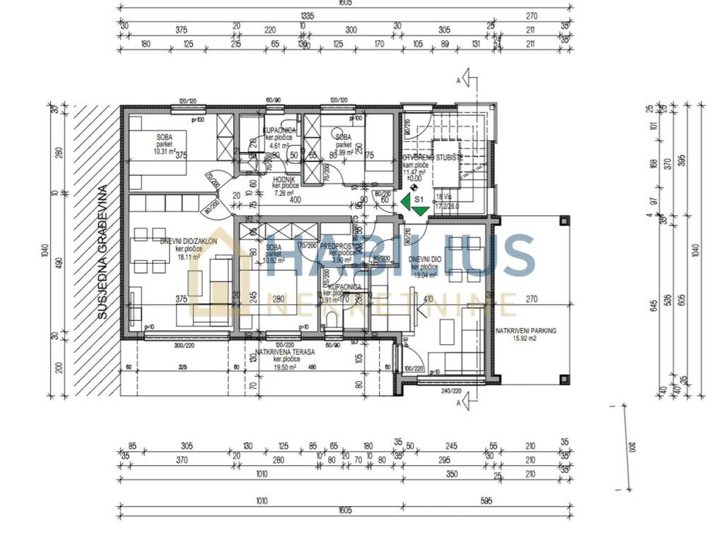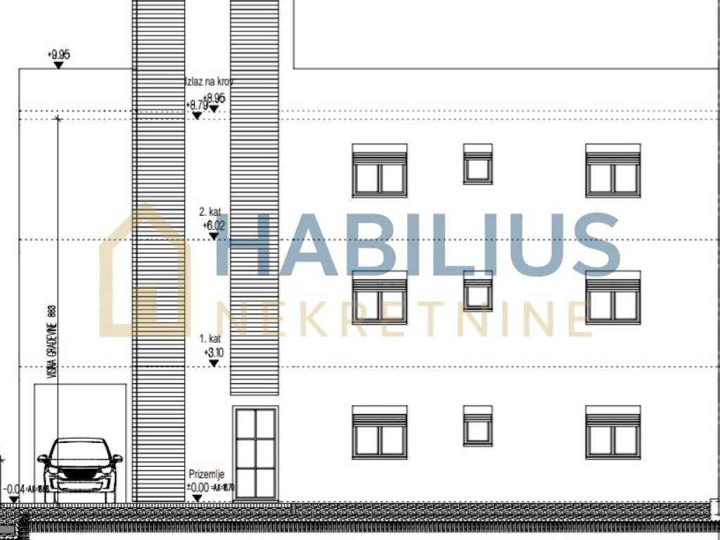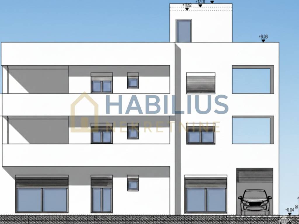 Prodaje se prostrani stan od 105 m2 (podne površine 117 m2), koji je u naravi podijeljen u dva (jednosobni komforni i dvosobni komforni), svaki sa svojim vlastitim ulazom. Smješten je na 1. katu stambene zgrade koja ima ukupno tri stana. Zgrada je u bloku sa susjednom kućom, i nalazi se između stare (udaljenost 130 m) i nove ceste (udaljenost 360 m). Udaljenost od mora je 400 m. U blizini svih sadržaja potrebnih za ugodan život – ambulanta, javni prijevoz, trgovina, vrtić, škola, plaža...te je idealan za obitelj, ali i kao investicija.