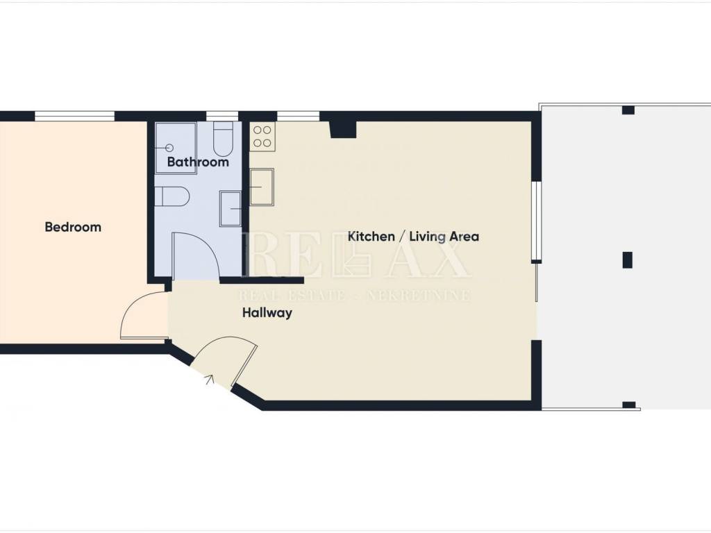 It consists of one bedroom, bathroom, living room connected to the kitchen and dining room, and two balconies - one covered and one open, with a total area of 9.81 m2.