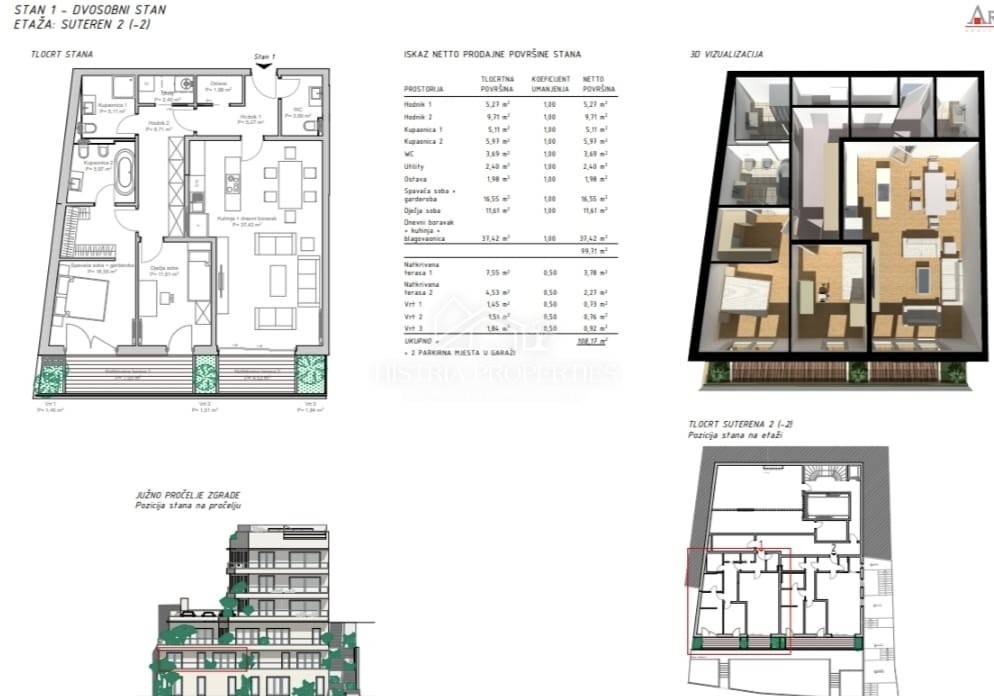 Apartment 1 located in the basement of the building on the (-2) floor consists of an open living room, dining room, two bathrooms, 2 bedrooms, boiler room and separate toilet with access to the terrace and a view of the beach below the building with an unobstructed view of the entire Kvarner. A truly impressive experience.