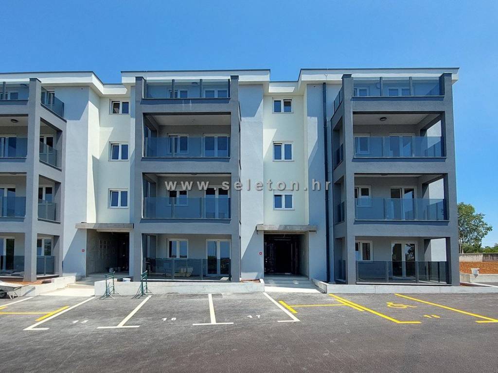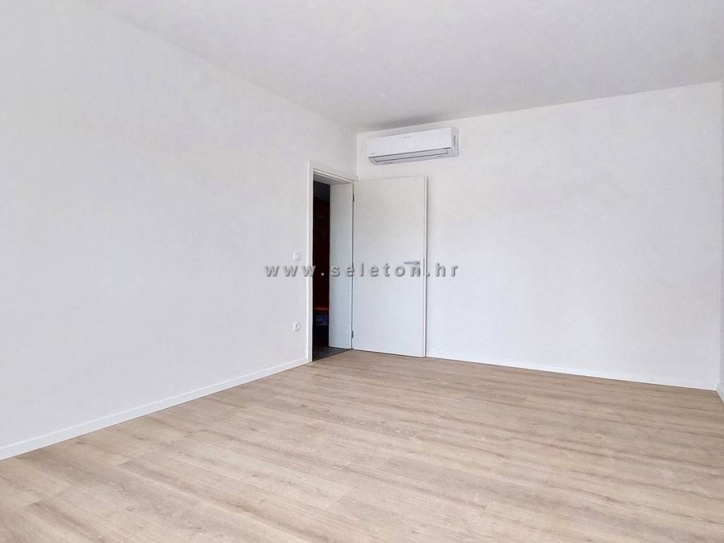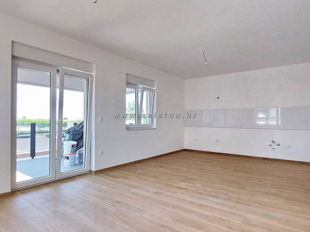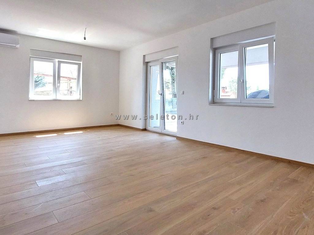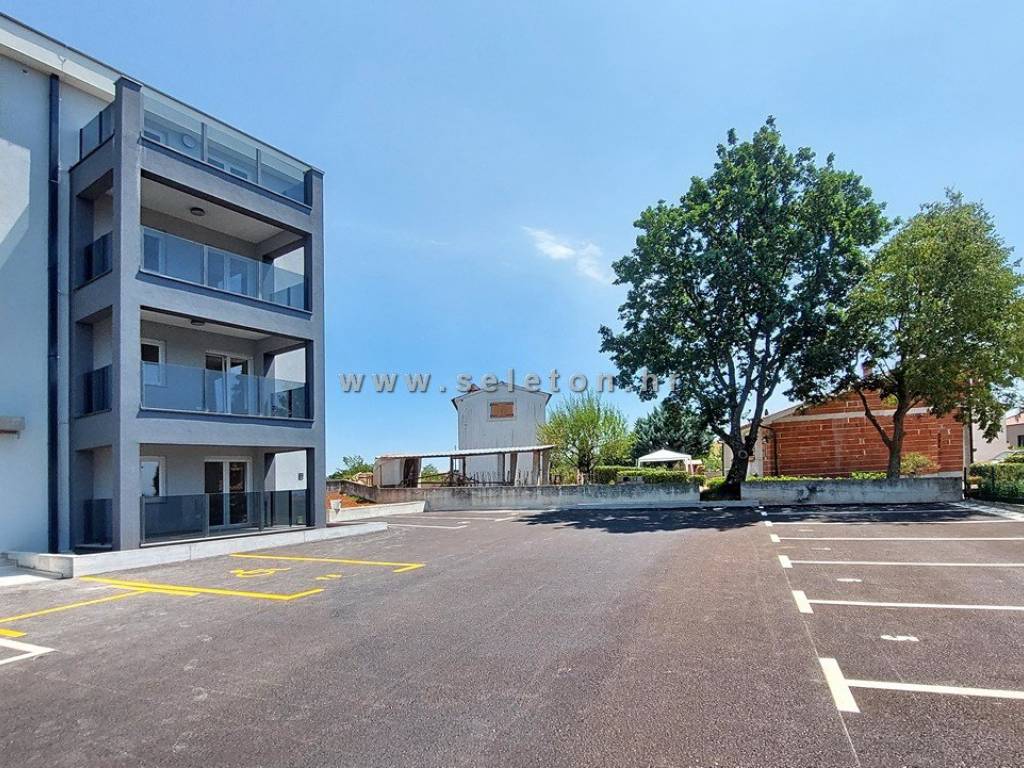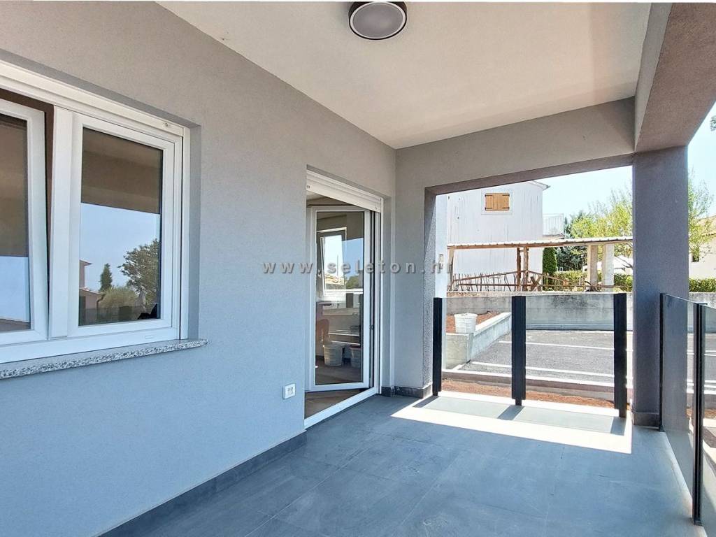 An apartment of 72 m2 for sale, consists of a kitchen, living room and dining room, hallway, 2 bedrooms, bathroom, toilet and 2 terraces. The apartment is located on the ground floor, has 3 air conditioners, security door, underfloor heating in the bathroom, it has one storage room in the basement of the building of about 6 m2, one parking space in front of the building and part of the garden around the apartment. The apartment is located about 7 km from Poreč and the sea, close to shops, schools and kindergartens.