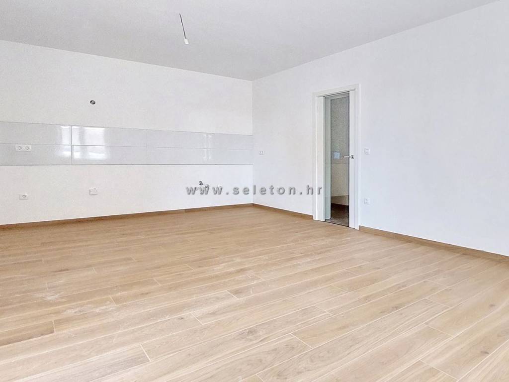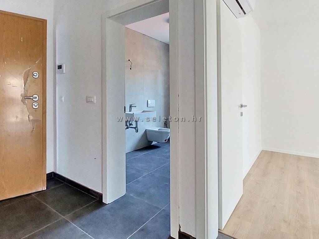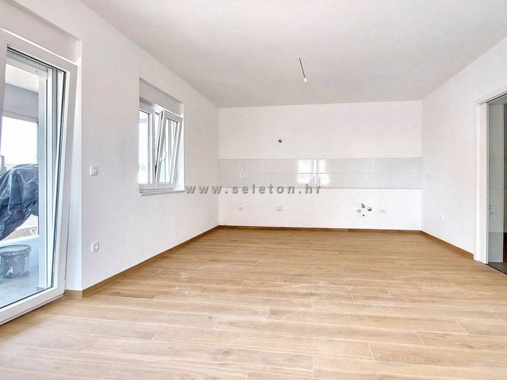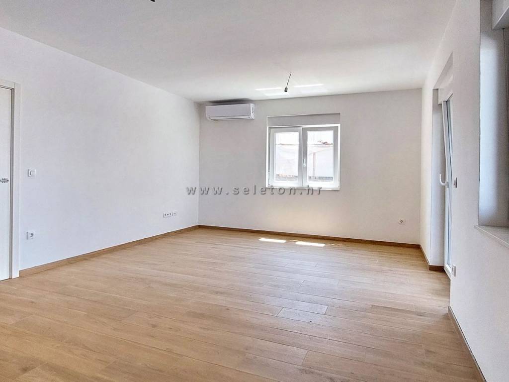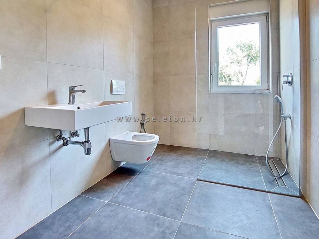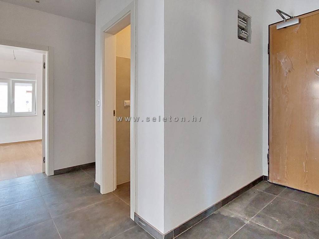 An apartment of 72 m2 for sale, consists of a kitchen, living room and dining room, hallway, 2 bedrooms, bathroom, toilet and 2 terraces. The apartment is located on the ground floor, has 3 air conditioners, security door, underfloor heating in the bathroom, it has one storage room in the basement of the building of about 6 m2, one parking space in front of the building and part of the garden around the apartment. The apartment is located about 7 km from Poreč and the sea, close to shops, schools and kindergartens.