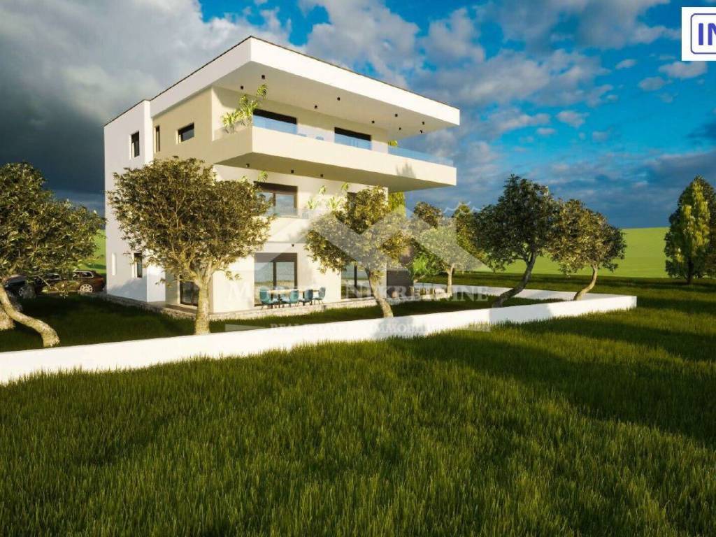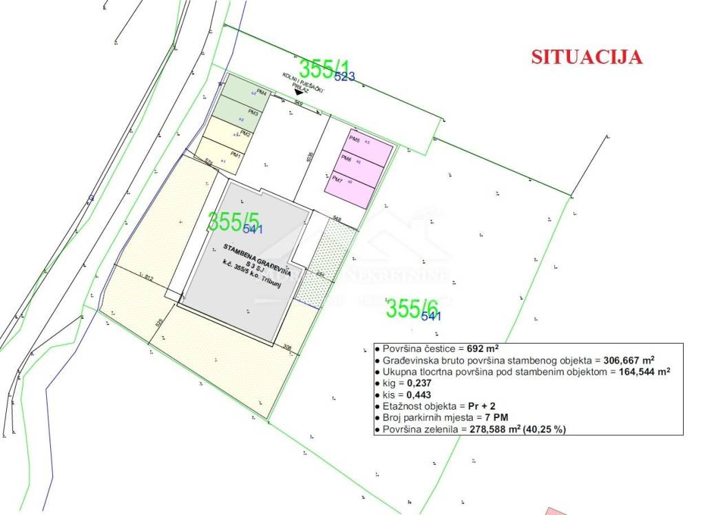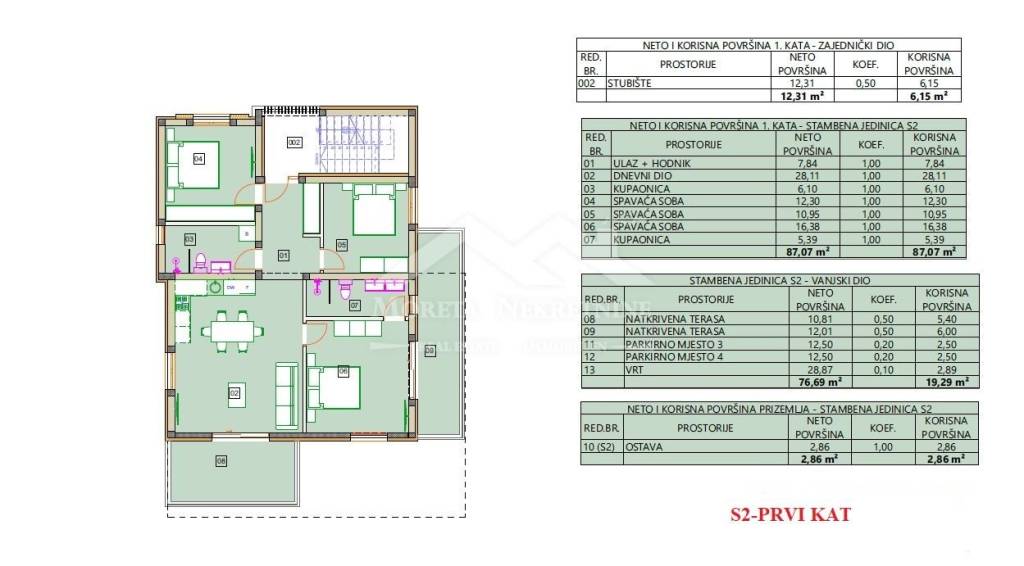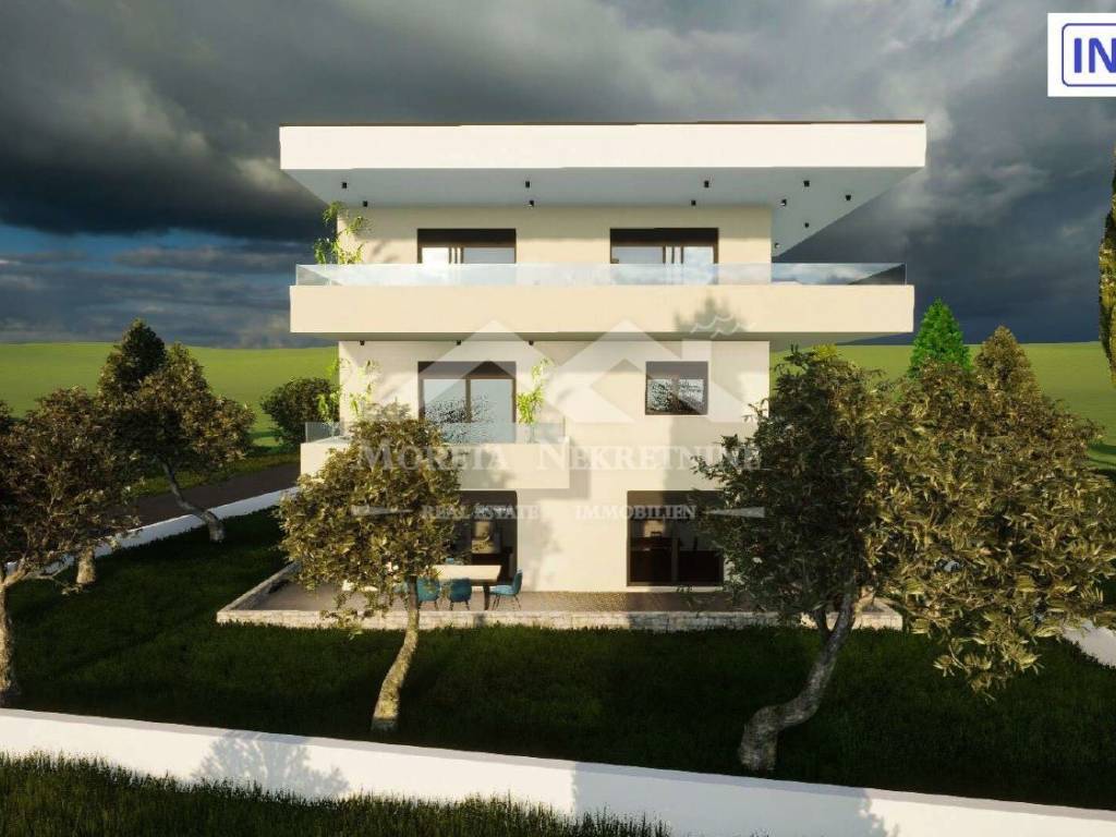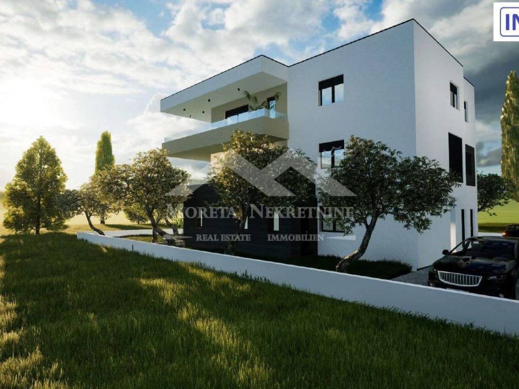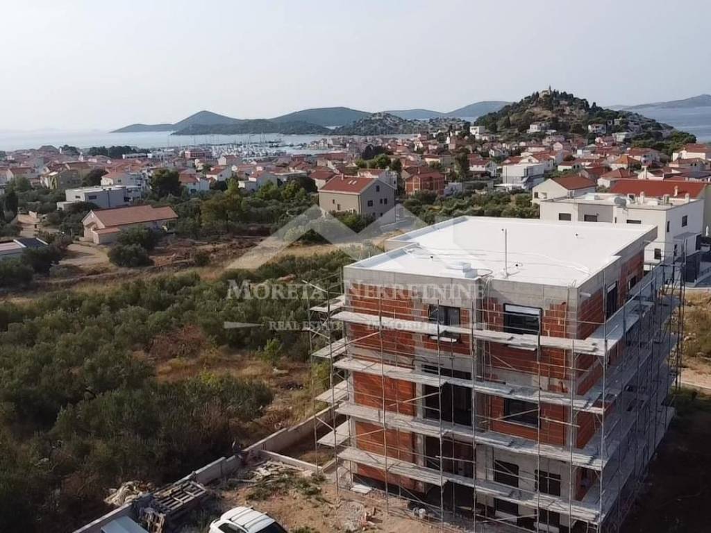 In Tribunj, a small picturesque town in the western part of the Šibenik-Knin County, at a distance of 750 meters from the city center, i.e. 500 meters from the beach, a new three-room apartment is for sale on the first floor of a smaller residential building with a total of three apartments. The building will be built on a plot of land with an area of ​​692 m/2. We offer an S2 apartment with a net area of ​​109.22 m/2, consisting of: an entrance with a corridor of 7.84 m/2, a living room with an attached kitchen and a dining room of 28.11 m/2 with access to a covered terrace of 10.81 m/2, three bedrooms, one of which is a master bedroom with an area of ​​16.38 m/2 with its own bathroom, while the other two rooms have an area of ​​12.30 m/2, or 10.95 m/2. From the master bedroom there is access to a covered terrace of 12.01 m/2. In addition to the above, the apartment also has a shared bathroom of 5.39 m/2. The apartment also has a storage room on the ground floor of 2.86 m/2. This apartment has two parking spaces, each of which has an area of ​​12.50 m/2, and the specialty of this property is the garden of 28.87 m/2. The building will be built according to the latest construction standards, and quality materials and equipment will be used, such as: quality internal carpentry with hidden hinges, roll execution of external carpentry in anthracite color, electric shutter lifters, glass fences on the terraces, quality floor coverings, etc. All apartments have air conditioning in all rooms, telephone and Internet connections, underfloor heating in the bathrooms and the living room, intercom with video display, etc. The building will be located in an excellent location, in a quiet urban area with excellent access and near most relevant facilities, and in addition to personal use, there is also great potential for touristic exploitation. The building permit has been issued, construction has been started, and the project will be completed by the end of 2025. Payment dynamics in agreement with the investor.
