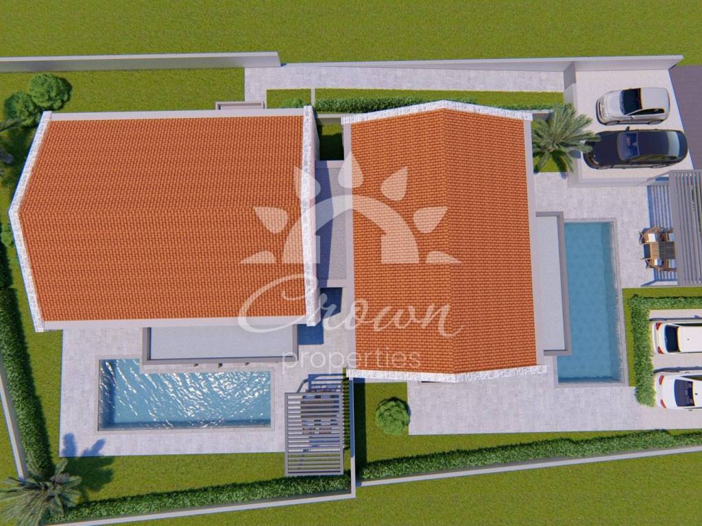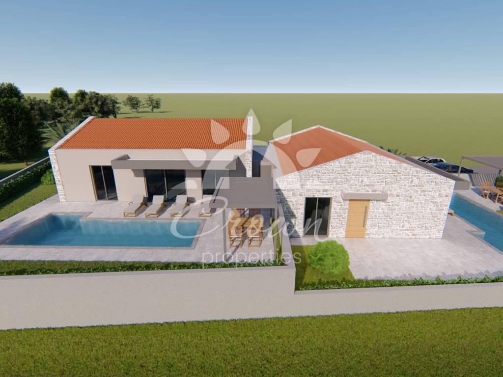 For sale are two modern ground-floor houses connected by storage rooms, but fully functioning as independent homes. Each house offers three spacious bedrooms, two bathrooms, and a comfortable living room with access to a 24 m² pool, making them an ideal choice for a family or as a holiday home. The houses are located just 10 minutes’ drive from Vižinada and 15 minutes from Poreč.