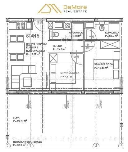 This is an apartment on the first floor of the building. The layout of the rooms consists of a hallway, 2 bedrooms, a bathroom, a kitchen with a dining room and a living room, and a partially covered terrace. The net usable area of the described premises with a terrace is 65.57 m2. In addition, the apartment has two parking spaces.