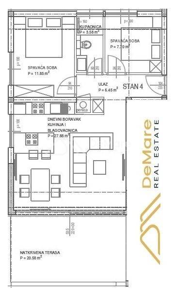 This is an apartment on the first floor of the building. The layout of the rooms consists of a hallway, 2 bedrooms, a bathroom, a kitchen with a dining room and a living room, and a partially covered terrace. The net usable area of the described premises with a terrace is 67.75 m2.