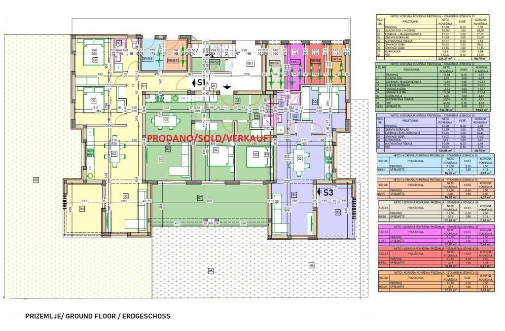 Apartment S3 on the ground floor has a total usable area of 58.75 m² and consists of: bedroom, bathroom, kitchen with dining area, living room, and a covered terrace. The apartment includes a garden of 50.92 m² and one parking space. PRICE: €182,500.00