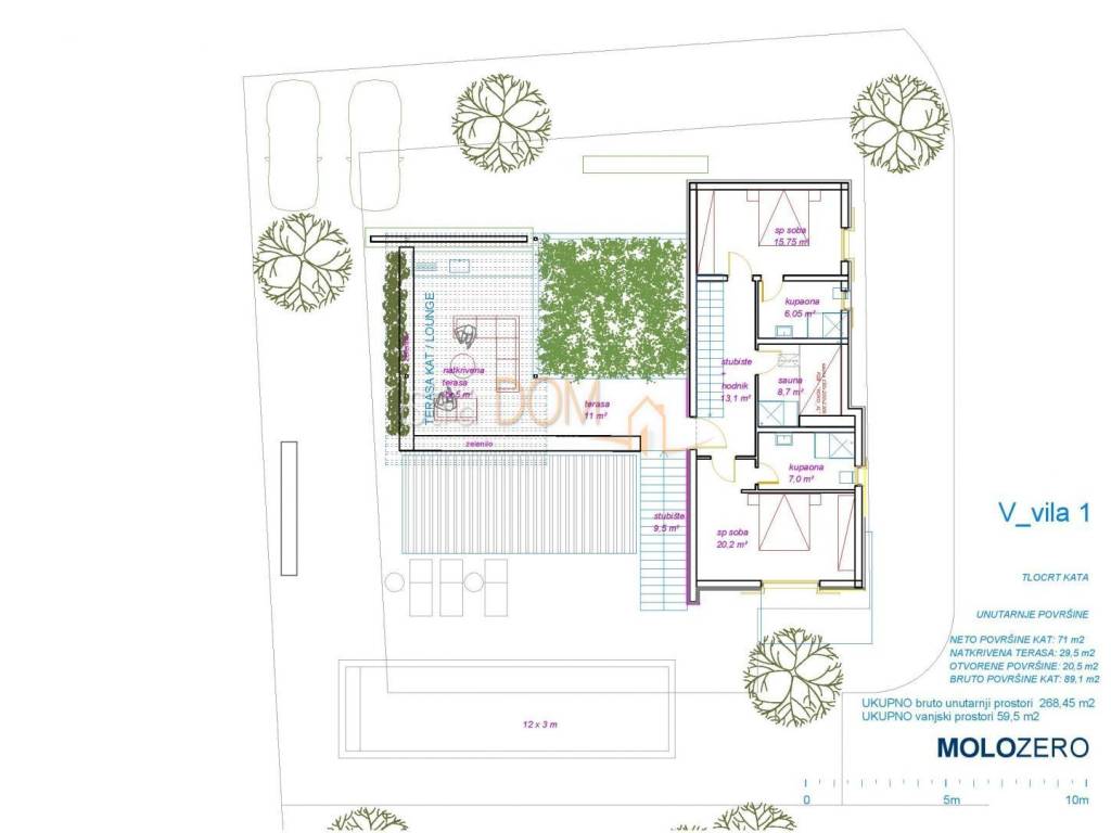 On the first floor there are 2 bedrooms with en suite bathrooms, sauna with shower as well as a large covered terrace with lounge and garden.