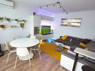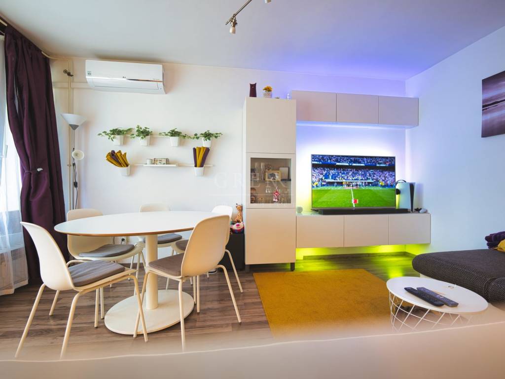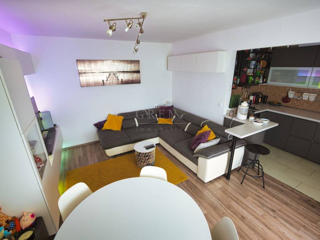 Stan je odlično orijentiran i ima velike staklene površine, što omogućuje obilje prirodnog svjetla tijekom dana. Prostor je funkcionalno organiziran, a opremljen je kvalitetnim namještajem. Dnevni boravak s kuhinjom i blagovaonicom (23,57 m2) čini središnji dio stana, pogodan za svakodnevne aktivnosti.