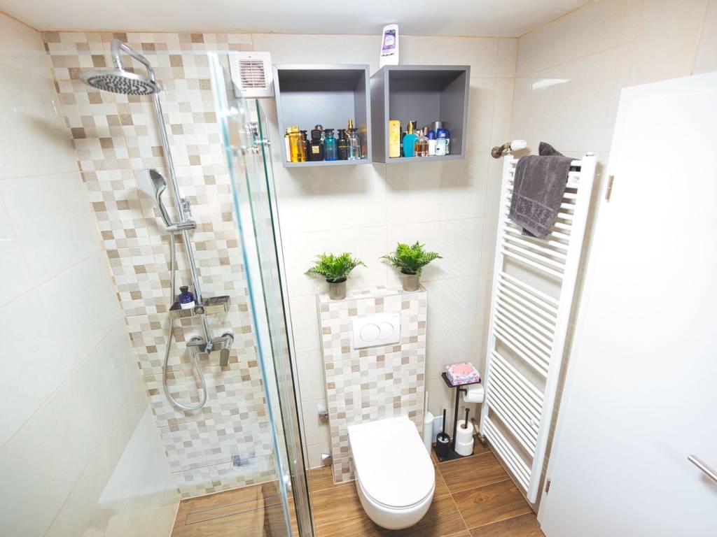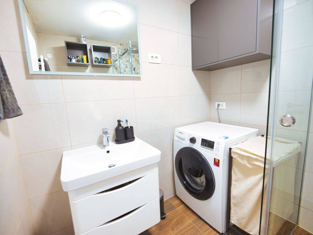 Stan ima novouređenu modernu kupaonicu i dodatni toalet, kao i ostavu (1,72 m2) te balkon (3,85 m2) s pogledom na okolno zelenilo. Uz stan dolazi i ostava u prizemlju zgrade (1,80 m2) te pristup zajedničkom spremištu za bicikle.