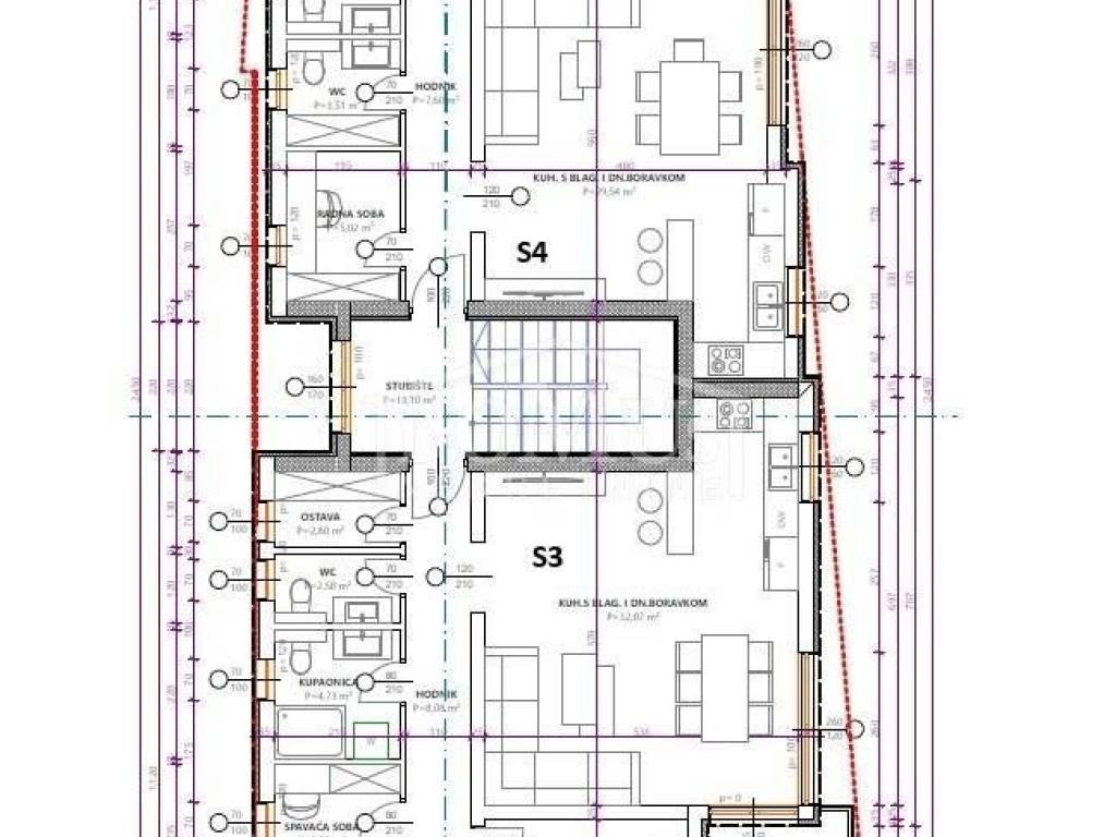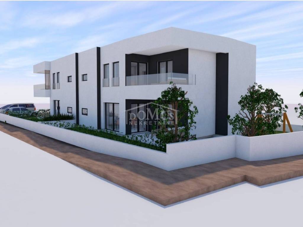 Vodice, new building, apartment on the 1st floor of a building with a total of four residential units. Apartment S4 is located on the 1st floor of the building, oriented to the east, with a total usable area of 74.05 m2. It consists of a hallway, toilet, bathroom, workroom, 2 bedrooms, a large living room with kitchen and dining room and access to a terrace. The apartment has one outdoor parking space. The property is 1500 m from the beach and 1300 m from the town center. The planned move-in date is summer 2026.