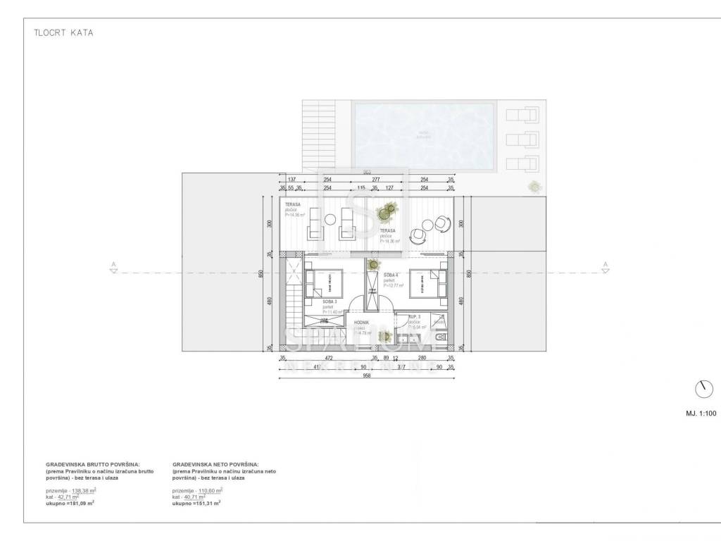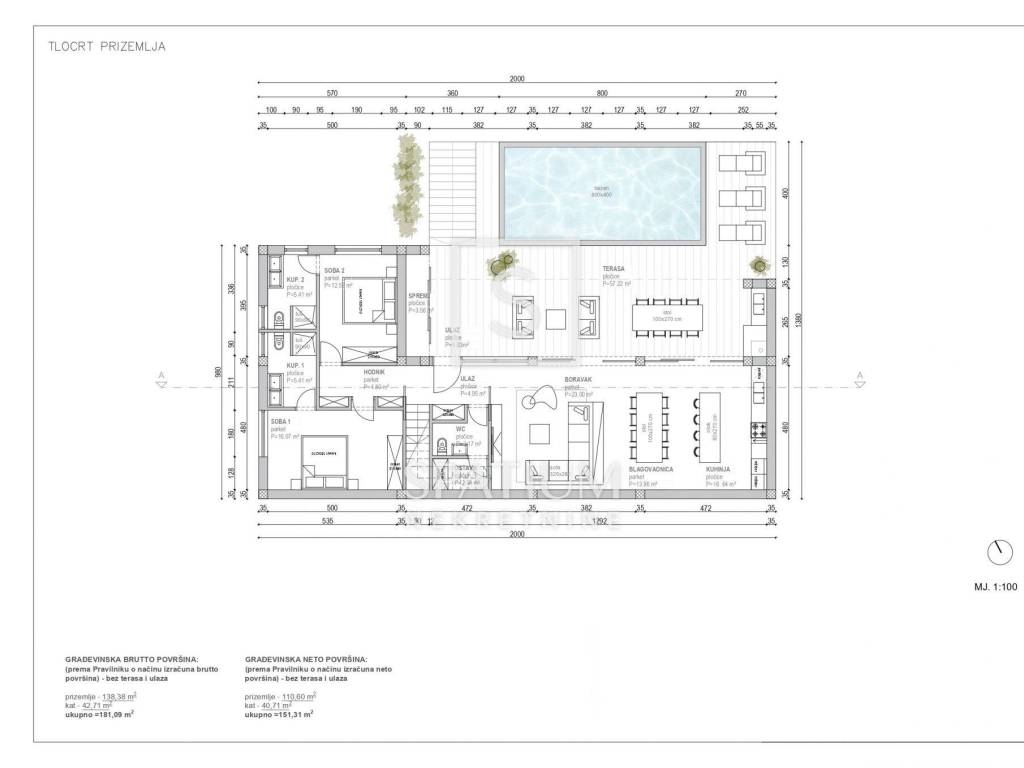 KAROJBA, u ponudu smo dobili građevinsko zemljište površine oko 850 m² s gotovim projektom i važećom građevinskom dozvolom za izgradnju moderne kuće s bazenom neto površine 185 m². Projekt predviđa prostrani dnevni boravak s kuhinjom i blagovaonicum te izlazom na natkrivenu i otvorenu terasu, četiri spavaće sobe, tri kupaonice te dodatni toalet u prizemlju. Parcela je pravokutnog oblika, južne orijentacije i smještena na blagoj padini, što joj omogućuje obilje sunca tijekom cijelog dana. Prilaz je moguć s dvije asfaltirane ceste, a priključci struje i vode nalaze se uz parcelu. U ponudi je i druga, gotovo identična parcela s građevinskom dozvolom istog vlasnika.