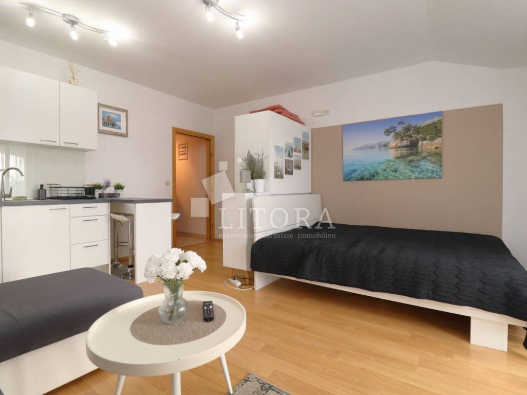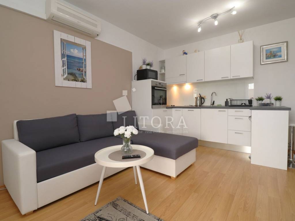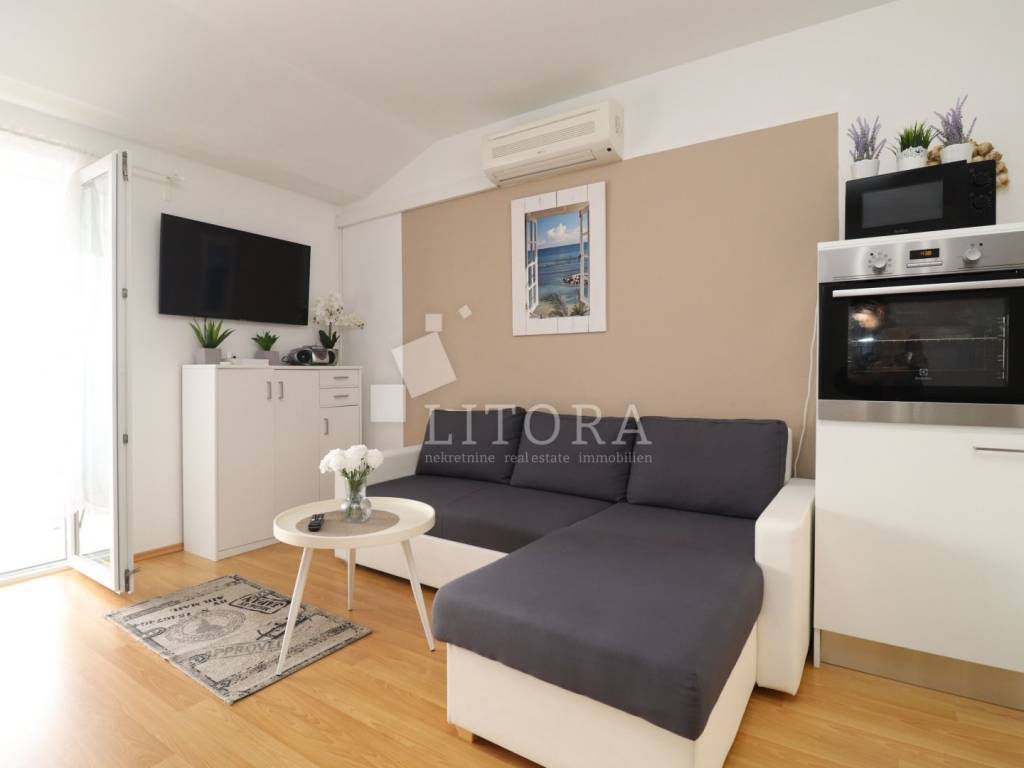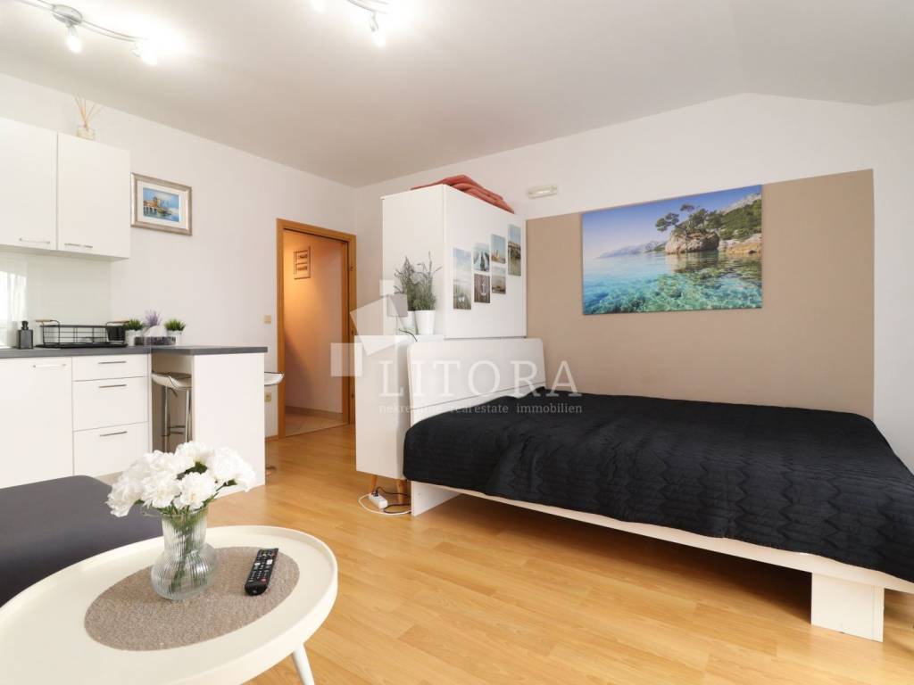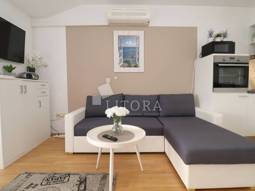 Srima – Fully furnished studio apartment with terrace and sea view. The apartment has a usable area of 39.62 m² and is located in a quiet part of Srima, in a multi-apartment building. It is situated in the high attic and consists of a hallway, bathroom, bedroom / kitchen with living room in one, and a large terrace wtih sea view. The apartment includes storrage and one parking space in the building’s courtyard. It is oriented to the south. Equipped with air conditioning, it is sold fully furnished, with all furniture included in the price. Distance from the beach is 200 m and from the town center 300 m.