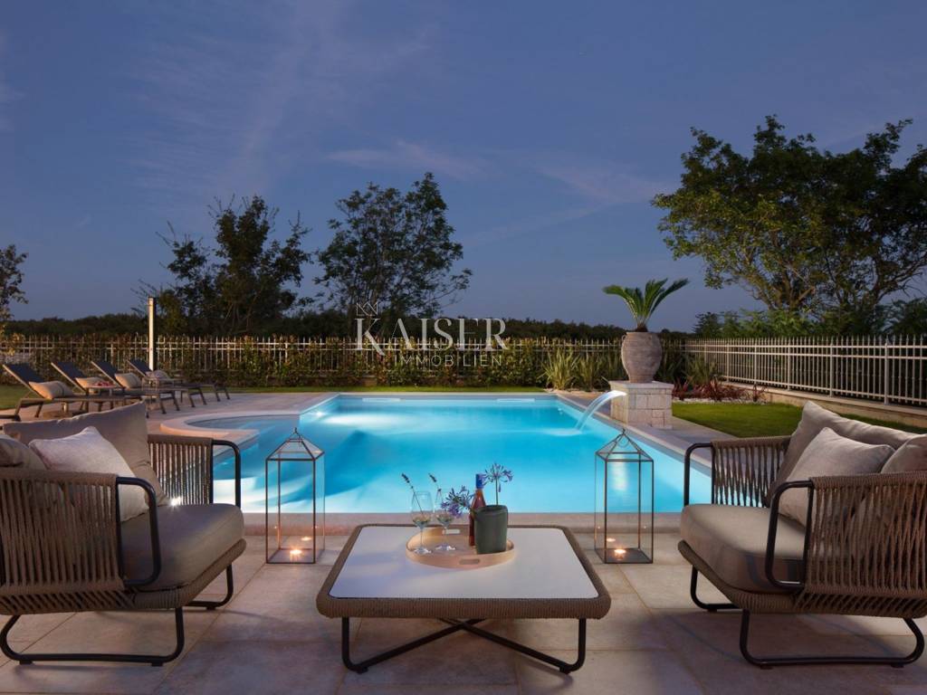 Kaiser Immobilien is putting on the market a luxury villa with a pool of 353 m2 on two fully air-conditioned floors with a capacity of 8 people. On the ground floor there is a spacious living room with a fireplace, a dining room with a table and chairs for 8 people, a fully equipped rustic kitchen, a bedroom with a double bed and a bathroom. There are three double rooms with bathrooms on the first floor. Two have a double bed, and one has two separate beds. Two rooms have access to terraces with an enchanting view of green landscapes, pastures where Istrian Boškarini cattle graze and the sea on the horizon. Luxurious and designer-furnished villa, with its own garden and swimming pool with hydromassage corner, located on the edge of the village of Ladići near Kanfanar, 23 km from Poreč and 26 km from picturesque Rovinj. The villa is luxuriously equipped and furnished with rustic furniture in the style of a castle, offering its guests a very high level of comfort, while the balcony on the first floor of the house offers a beautiful panoramic view of the sea. The villa has common facilities that represent a unique offer for this type of holiday home in Istria, consisting of 2 tennis courts, a multi-purpose playground for basketball, volleyball and indoor soccer, a bowling alley, outdoor fitness, a children's playground and a garden where the guests of the house they can pick organically grown vegetables. All the listed facilities are of course included in the price. The fenced and closed sports residential complex covers an area of 5600 m2. All courts have lighting so that they can be used at night. The complex consists of: - ecological garden - landscaped area with equipment - landscaped children's playground - two tennis courts - two bocce courts - handball court - basketball court - court for volleyball - outdoor fitness