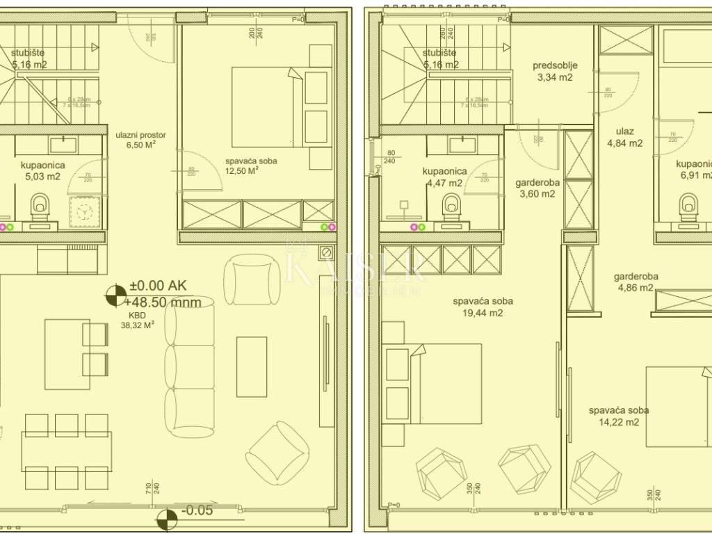 Kaiser Immobilien presents: Luxury two-storey terraced villa with swimming pool and sea view We present a luxury two-storey terraced villa, with a spacious garden, swimming pool and beautiful views of the sea and islands, which combines comfort with modern architecture. Total area 171.89 m². Additional advantages of the villa are an open concept living room and kitchen, spacious bedrooms with wardrobes and private bathrooms as well as a large terrace and garden. Built from high-quality materials, the villa has external walls made of reinforced concrete (20 cm), additionally insulated with EPS insulation (5-10 cm) and finished with facade plaster. An advanced thermal and sound insulation system ensures maximum comfort in every room. Customers are offered the opportunity to order and make custom-made furniture, tailored to personal wishes and needs. Each villa is separated by high perimeter walls that protect privacy and provide security. The main enclosure wall with a height of 1.80 m extends along the entire plot, while the second wall, located above the main enclosure wall, which divides the space between the villa and the yard, also has a height of 1.80 m. The villa consists of: Ground floor - Entrance area: 6.50 m² - Living room + dining room + kitchen: 38.32 m² - Staircase: 5.16 m² - Bedroom: 12.50 m² - Bathroom: 5.03 m² First floor - Hallway: 3.34 m² - Wardrobe: 3.60 m² - Bathroom: 4.47 m² - Bedroom: 19.44 m² - Entrance: 4.84 m² - Bathroom: 6.91 m² - Wardrobe: 4.86 m² - Bedroom: 14.22 m² Outdoor areas - Uncovered terrace: 47.23 m² - Garden: 70.79 m² - Pool: 24 m2 - Parking space: 20.12 m² Located in a quiet and picturesque Dalmatian village of Sv. Filip i Jakov, the villa is located in the immediate vicinity of Biograd na Moru and only 25 km from Zadar. This location provides a balance between privacy and proximity to all necessary amenities. Away from the hustle and bustle of the city, yet close to the sea and the town center, the villa is ideal for a relaxed life or a profitable tourist investment. Sv. Filip i Jakov, located on the Adriatic coast, is a place known for its beautiful beaches, crystal clear sea and indented coastline in the immediate vicinity of the Kornati National Park. It is located 4 km from the town of Biograd na Moru, and only 25km from the town of Zadar. Distances: A1 motorway (Benkovac exit) – 20 km Zadar airport – 25 km National parks: - Kornati (boat trips from the town) - Krka – 50 km - Paklenica – 60 km - Vrana Lake (nature park) – 10 km Split – 144 km Zadar – 25 km Don't miss the opportunity to become the owner of this luxurious home! The buyer's commission is 3% + VAT and is charged with the first legal act. For more information, please contact us with confidence: Tel.: 00385992510230 Email: marijana.papic@kaiser-immobilien.hr