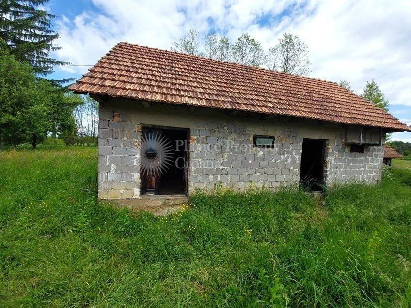 This offering includes a wooden house situated on a large parcel of land in the village of Svojić, with a total land area of 73,500 m, of which 16,739 m is directly connected to the house. This portion of the land is a flat, green surface, ideal for gardening, keeping animals, or future development. The house itself is legal, while several additional outbuildings on the property are not legalized.