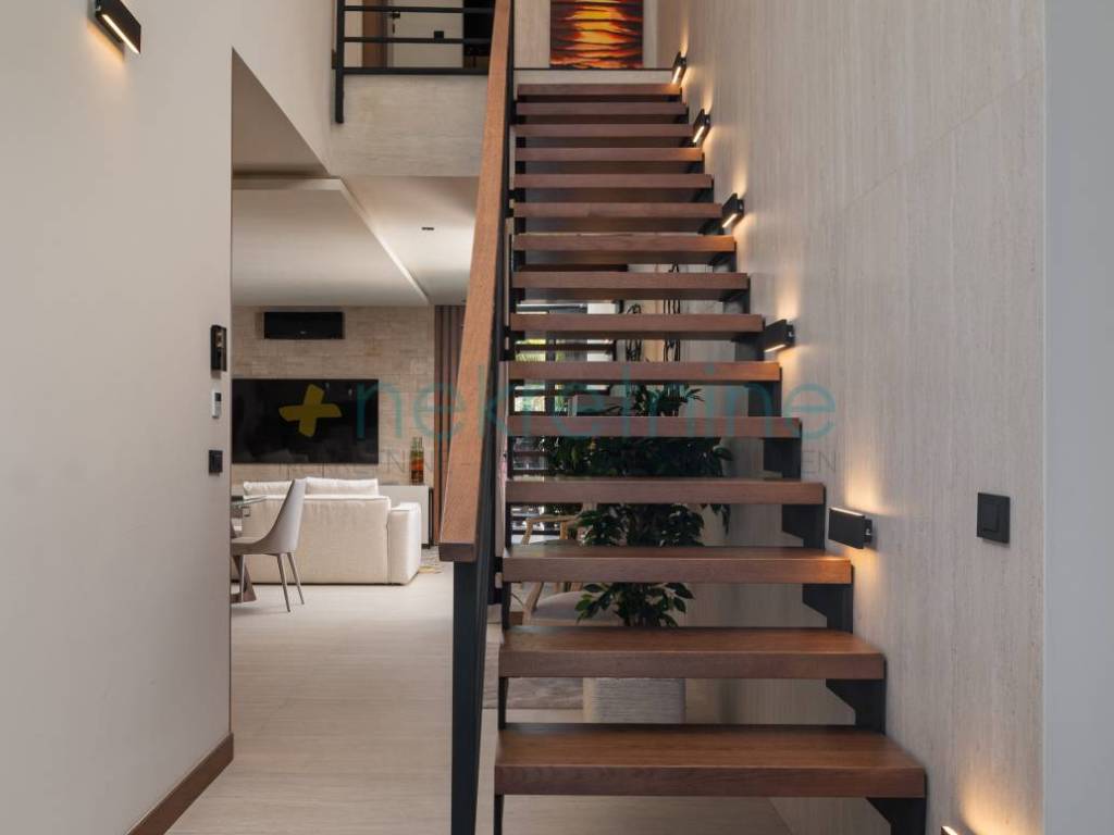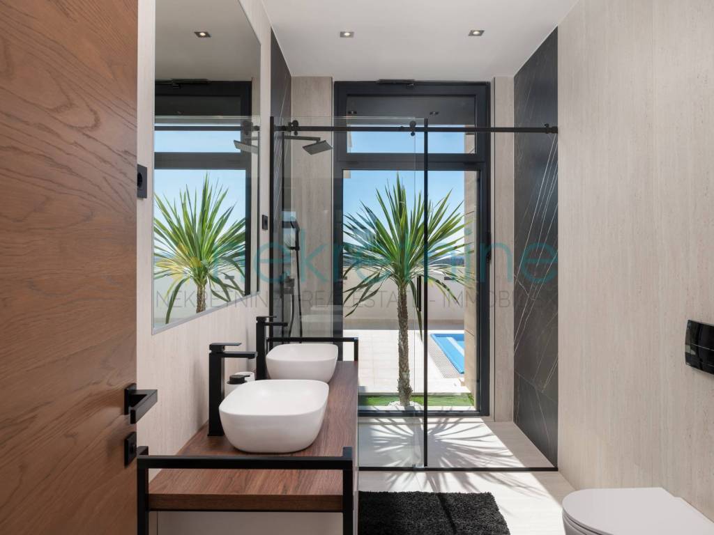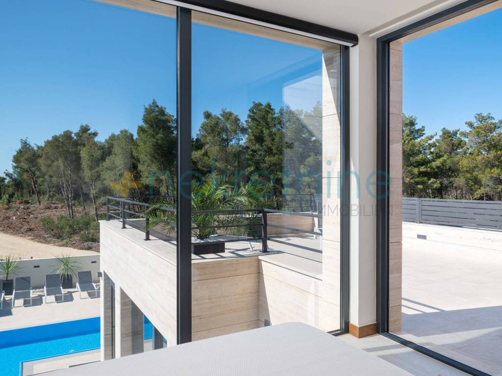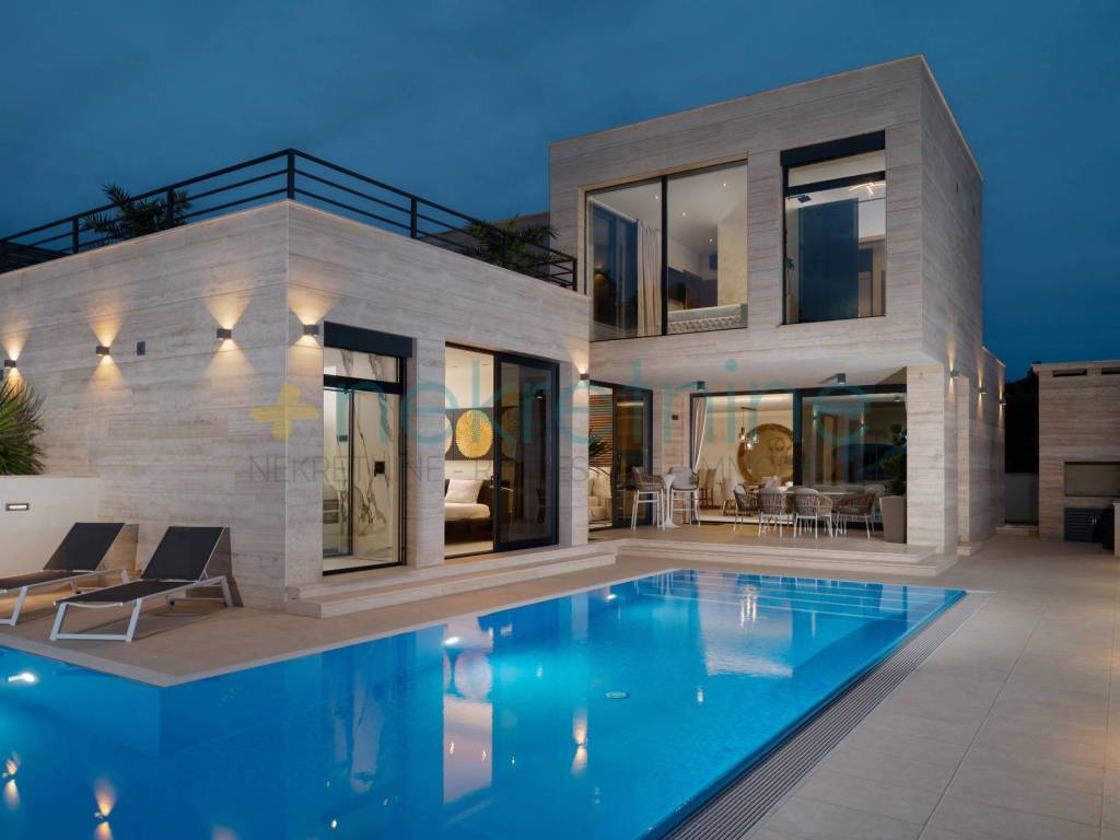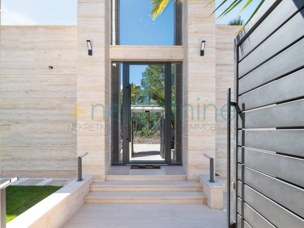 Ova moderna vila izgrađena je od vrhunskih materijala, uključujući talijanski travertin, prirodni kamen i keramičke pločice, a odlikuje se elementima od prirodnog drva i luksuznim vanjskim prostorima. Sadržaji uključuju podno grijanje u svim prostorijama, klimatizaciju, video nadzor, sustav za bežično upravljanje, grijani bazen, vanjski tuš, roštilj s ljetnom kuhinjom i još mnogo toga.