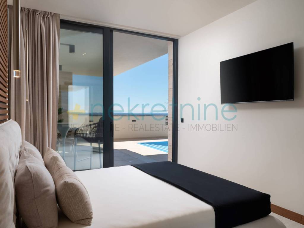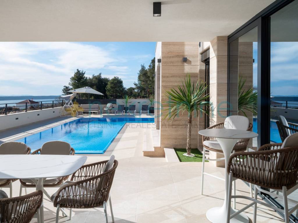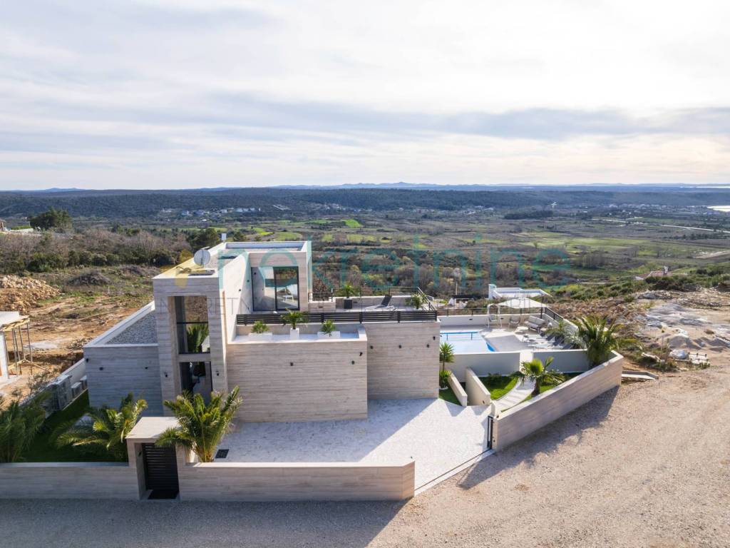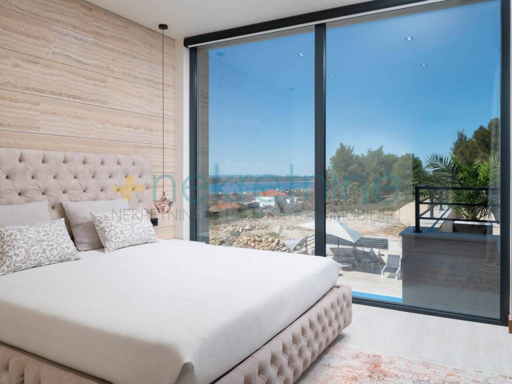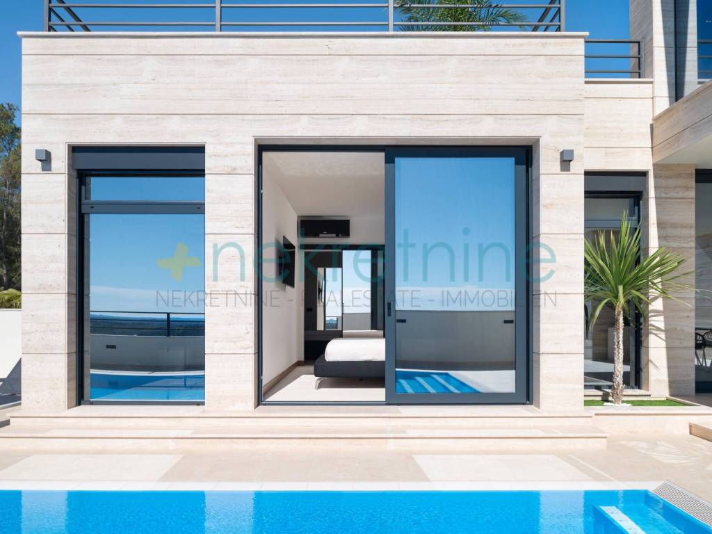 Vila se prostire na 738 m zemljišta i nudi 200 m elegantnog stambenog prostora. U prizemlju se nalazi prostrani dnevni boravak, kuhinja i blagovaonica, spavaća soba s privatnom kupaonicom i garderobom, praonica, WC za goste, te velika natkrivena terasa koja vodi do vanjskog prostora s luksuznim bazenom od 45 m. Unutarnje stepenice vode vas na prvi kat gdje se nalaze dvije spavaće sobe, svaka s vlastitim kupaonicama i garderobama, te pristup krovnoj terasi s jacuzzijem i spektakularnim pogledom na more.