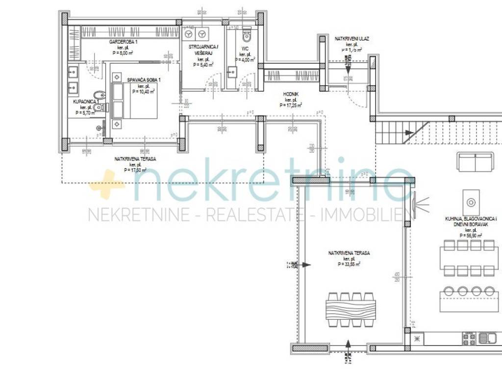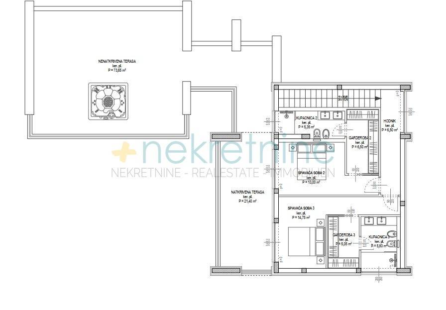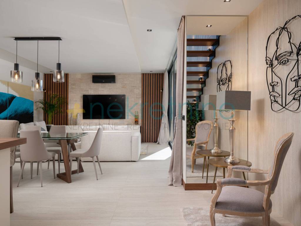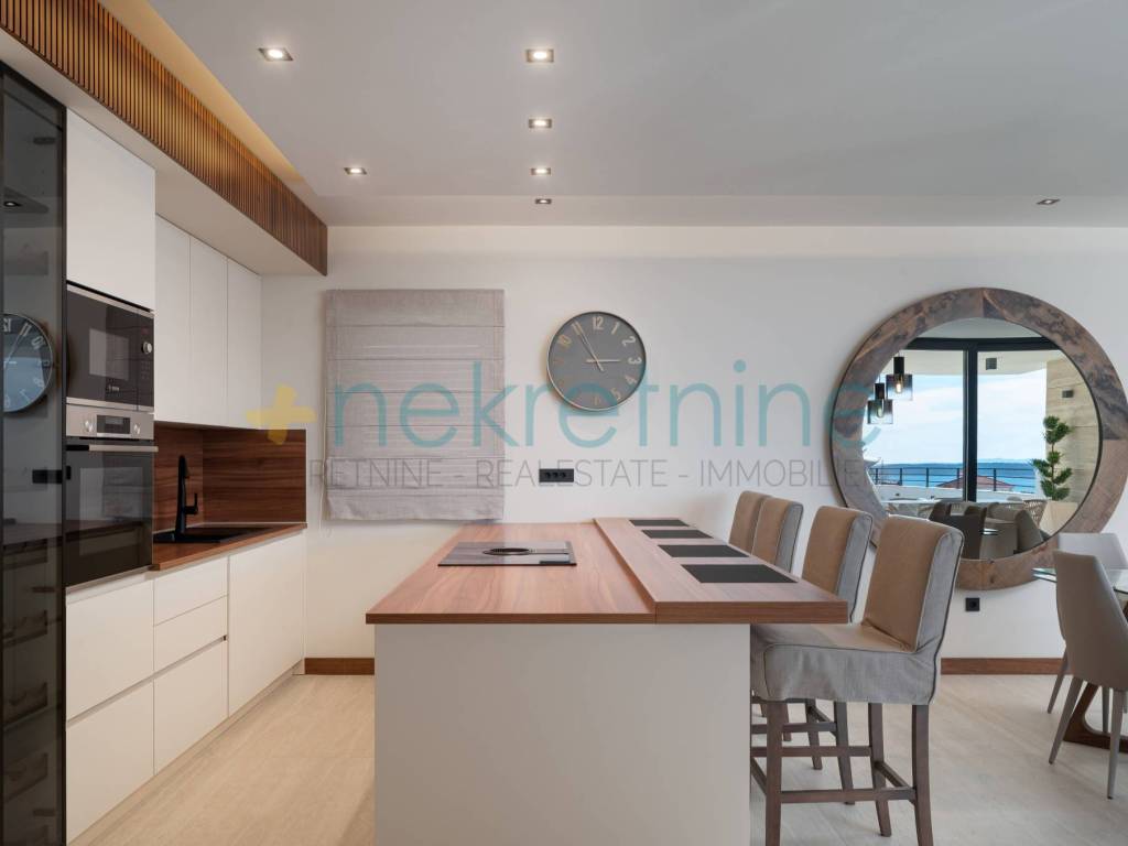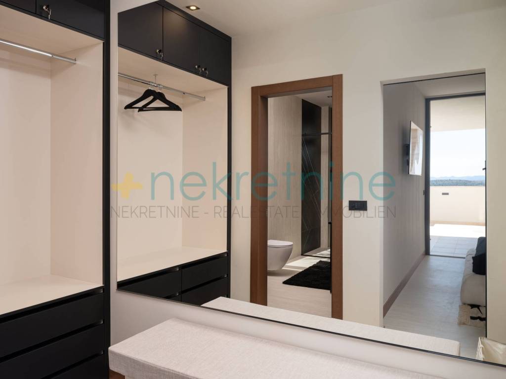 Vila se prostire na 738 m zemljišta i nudi 200 m elegantnog stambenog prostora. U prizemlju se nalazi prostrani dnevni boravak, kuhinja i blagovaonica, spavaća soba s privatnom kupaonicom i garderobom, praonica, WC za goste, te velika natkrivena terasa koja vodi do vanjskog prostora s luksuznim bazenom od 45 m. Unutarnje stepenice vode vas na prvi kat gdje se nalaze dvije spavaće sobe, svaka s vlastitim kupaonicama i garderobama, te pristup krovnoj terasi s jacuzzijem i spektakularnim pogledom na more.