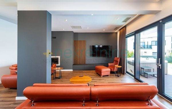 Dnevni boravak je također otvorenog koncepta i nalazi se odmah uz blagovaonicu. Opremljen je kaminom, udobnim sofama, velikim SMART TV-om i elegantnim detaljima, što ga čini idealnim prostorom za opuštanje i druženje.