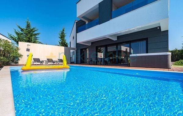 Moderna vila u Novalji na otoku Pagu oduševljava svojim sofisticiranim i elegantnim dizajnom. Smještena nedaleko od mora, ova luksuzna vila pruža prekrasan pogled na Jadransko more i okolni krajolik, kombinirajući udobnost i suvremeni stil života.